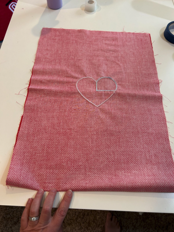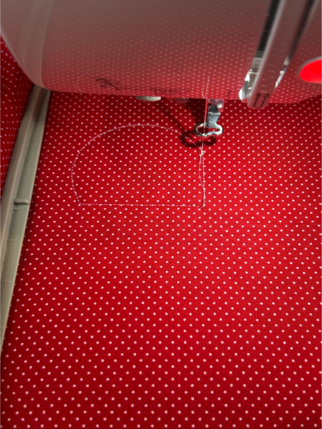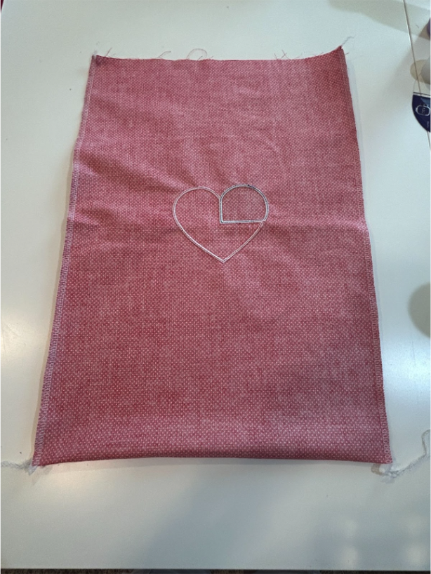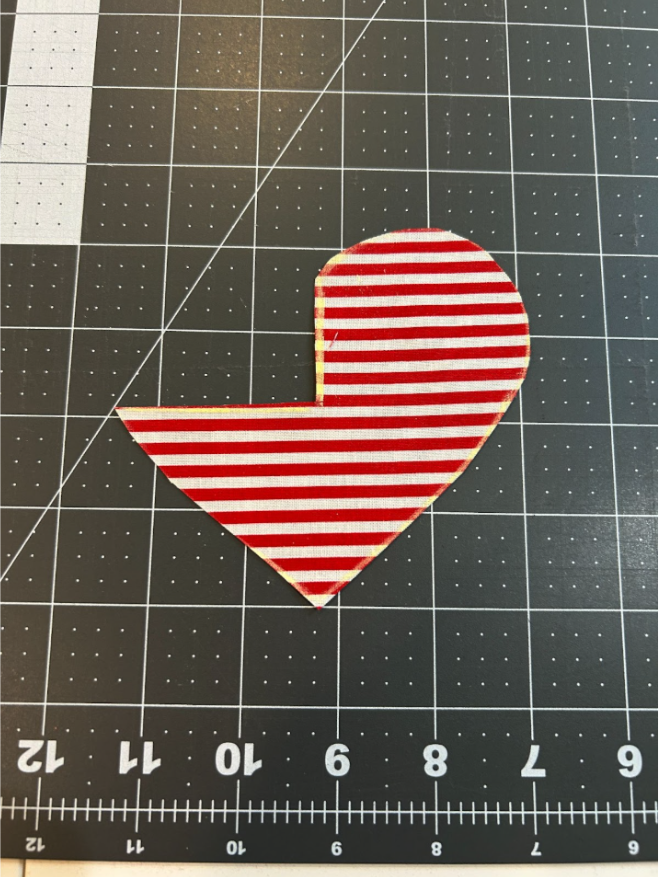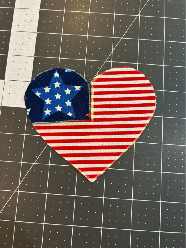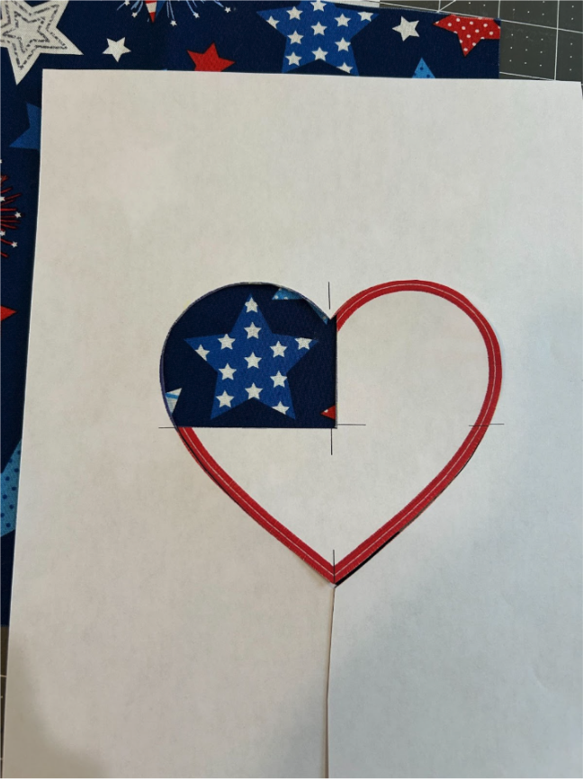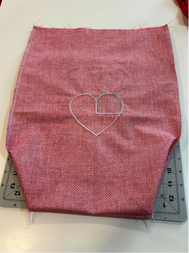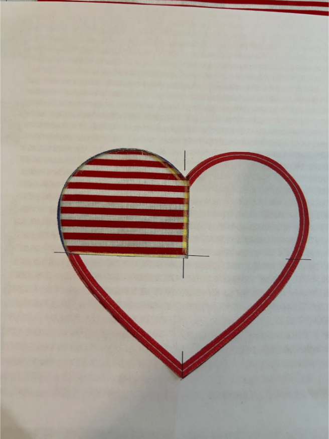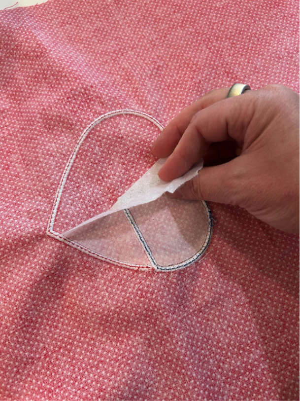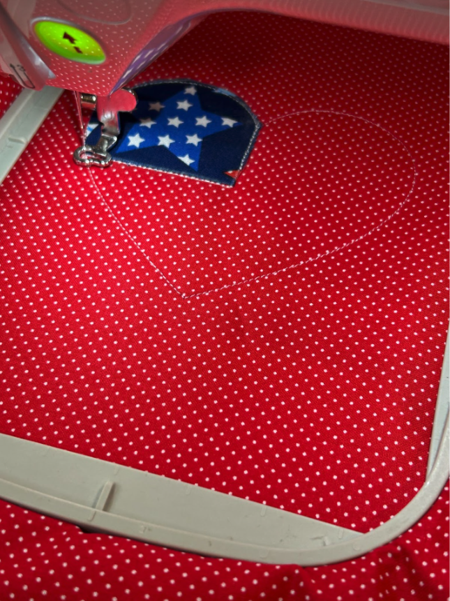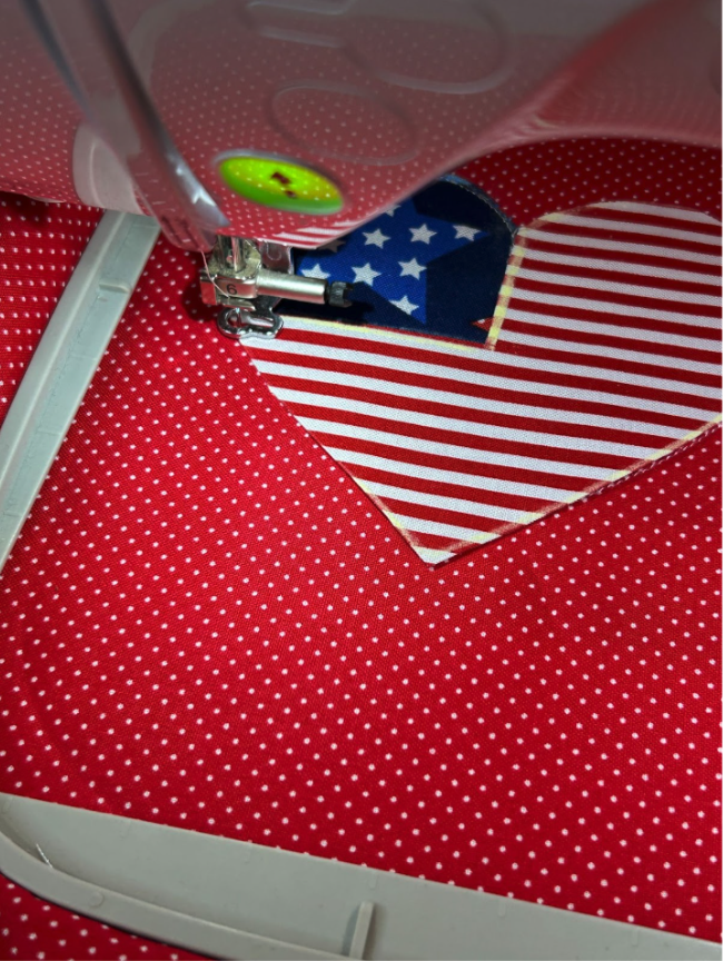 We have all the pieces tacked down, and we will now do the finishing stitches. I like to start the stitching and check after the zigzag stitches. On this one, I trimmed up the point of my heart because it wasn’t going to be caught in the cover stitches.