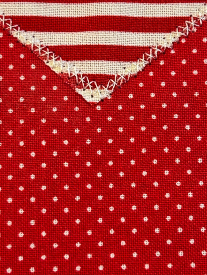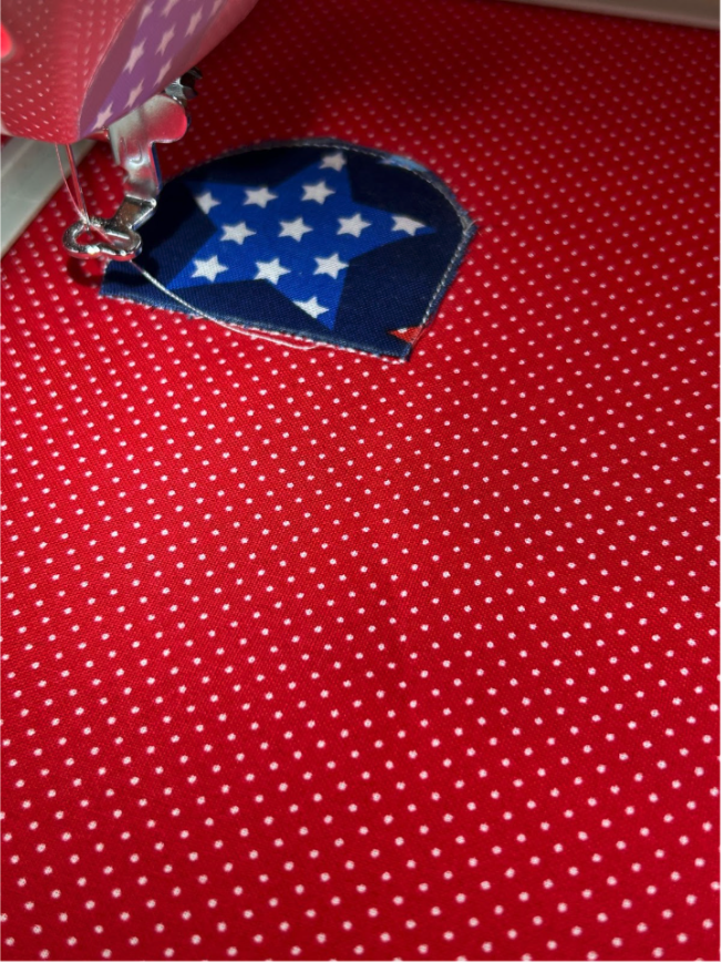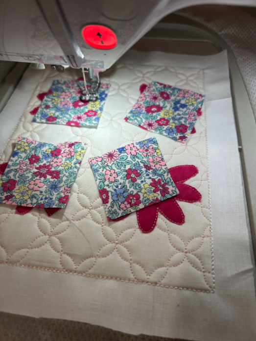 Cover the stitches with the fussy cut piece and run the tack-down stitches.