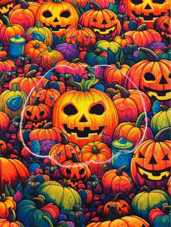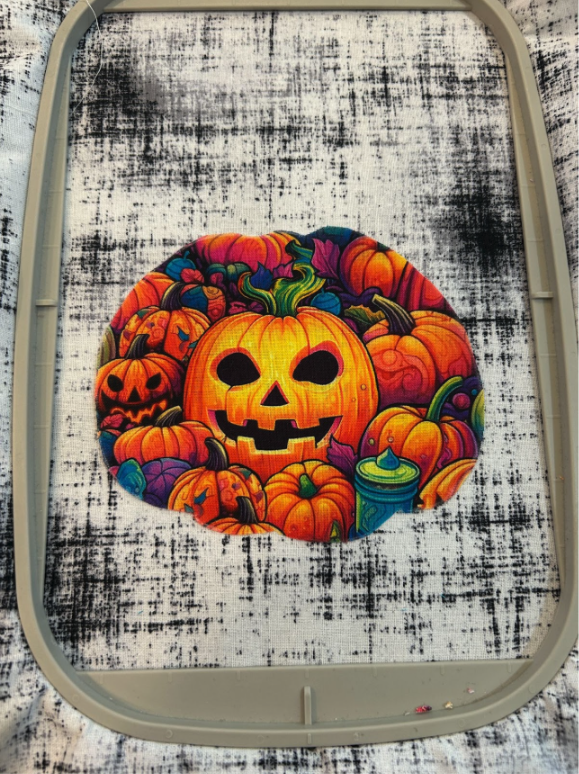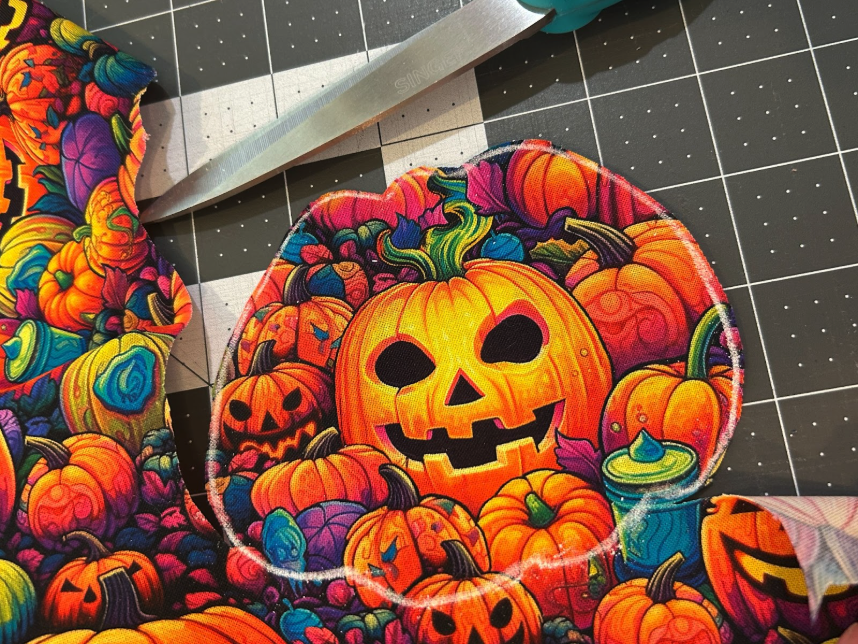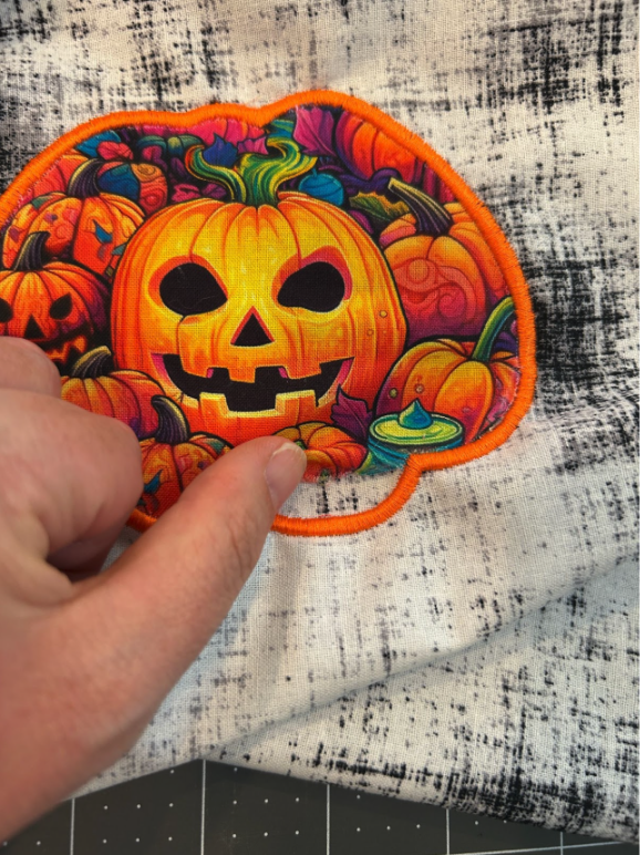 Using the window, find the placement you’d like in your fabric. I wanted to center on the big jack-o-lantern in this busy fabric.