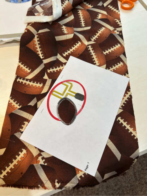 I wanted only the brown from this football fabric for the ball part of the design since the design included white stitching. Using my window, I found where it worked out. I traced it and cut it out.