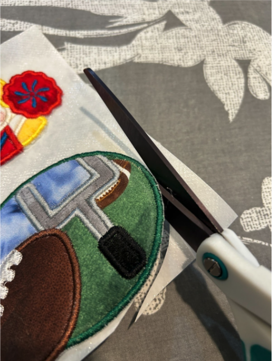 Let’s get back to making the gift bag we started in the first section. To turn our fussy cut applique pieces into a gift bag, we need to clean up the back of our designs by trimming fabrics and removing the stabilizer.