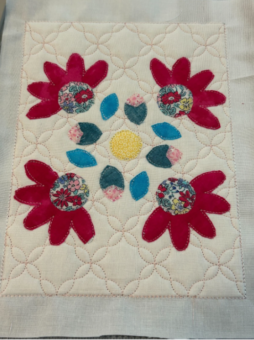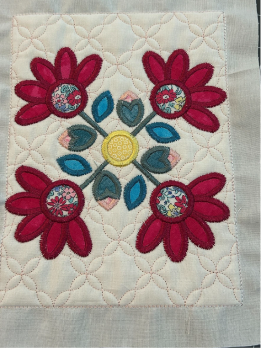 Start your applique block and use your memory fabric for one of the design elements. I chose to put it in the center circles of the flowers.