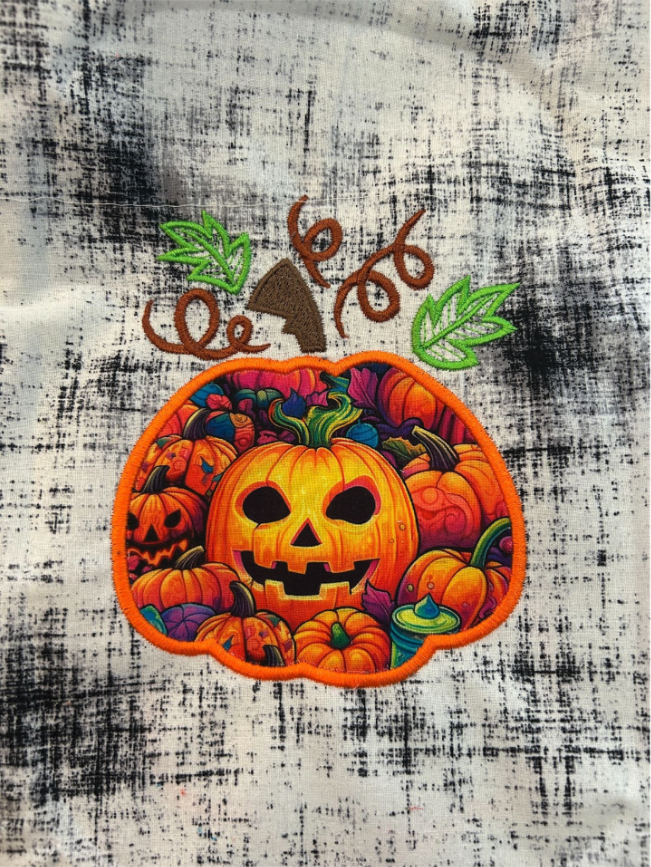 When we do fussy cutting, it’s best to use a design that has a bigger open space. But that doesn’t mean we need to search for a design that’s only an outline. For this pumpkin I chose the Happy Halloween Pumpkin Applique, and we will just use the outer stitches and ignore the inner stitches.