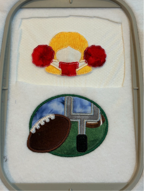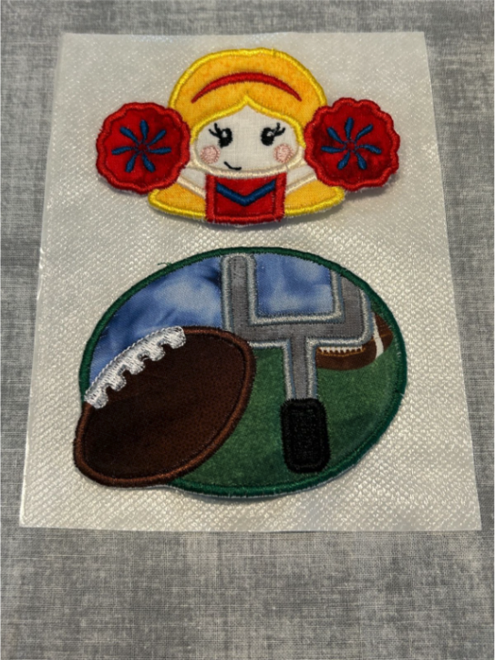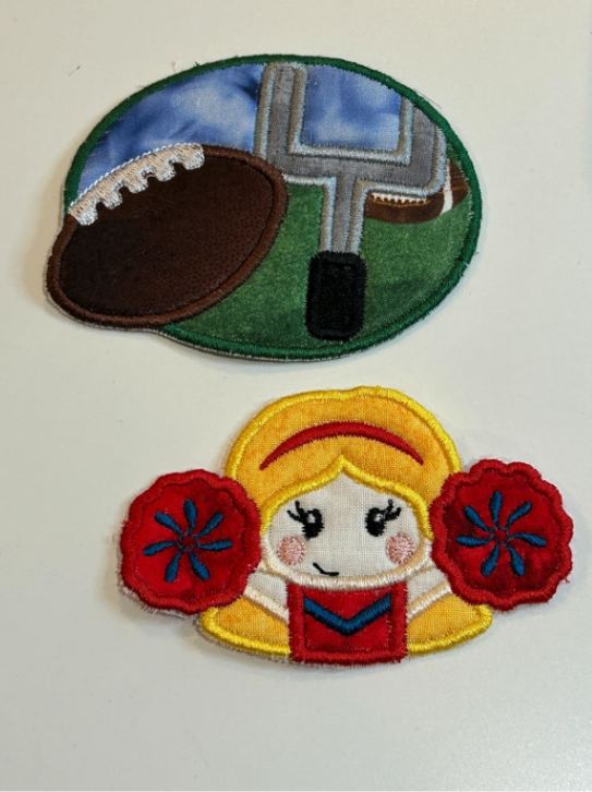 We can fussy cut fabric or use memory fabric to make patches to adorn our clothes or bags. I made a football patch and a cheerleader patch.