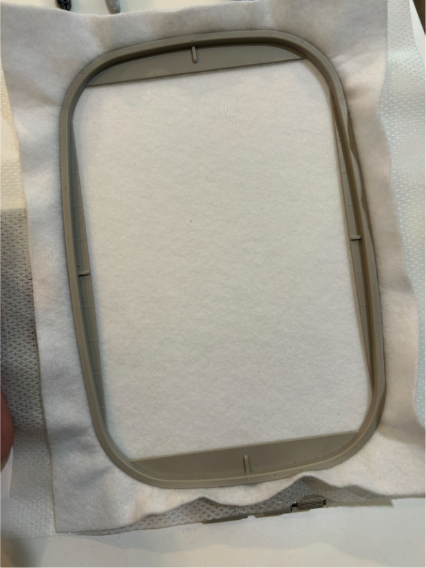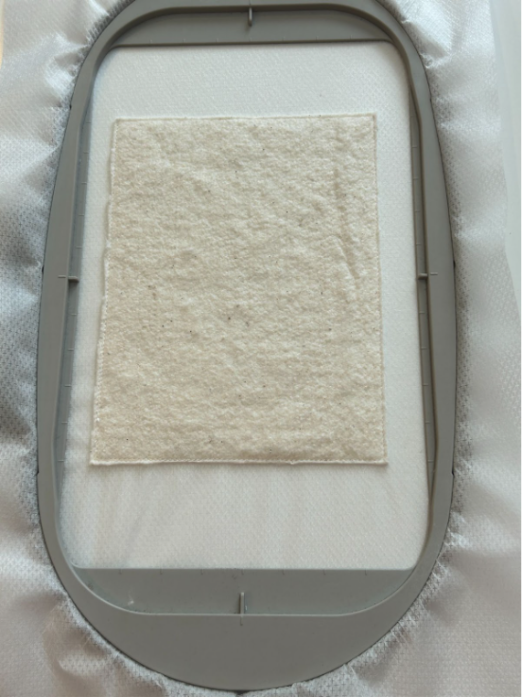 Hoop your stabilizer. We will first do the quilting backdrop on your background fabric. Your first stitches will be the placement for your batting, and the next to tack down the batting. Trim it close to the stitches.