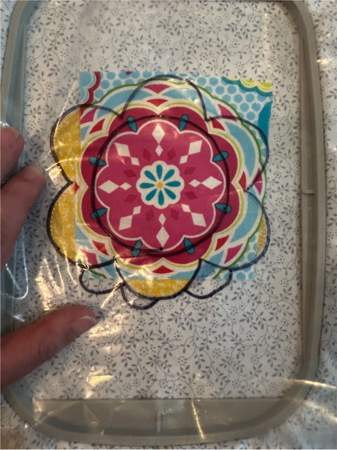 Remove your hoop from the machine and place your window and fabric on the design. Use the permanent lines for the other applique pieces to ensure it’s all lined up. And make sure the fussy cut fabric is where you want it.