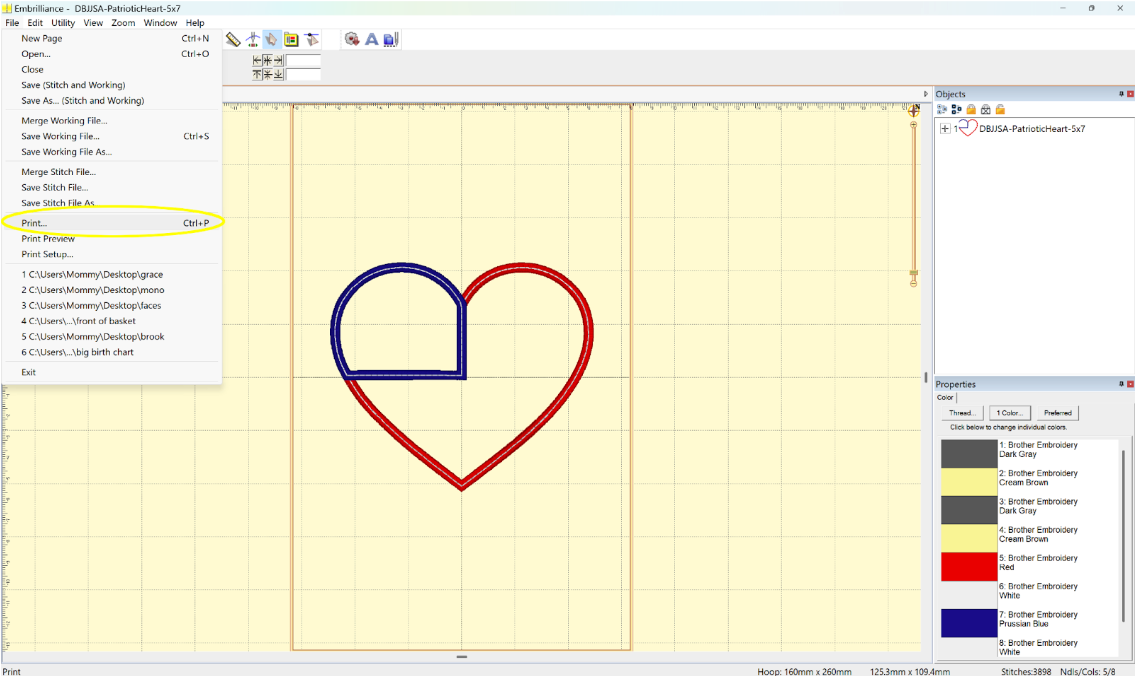 The first design I’d like to do is a 4th of July design. I opened up the design the size I’m using in Embrilliance and printed it. When you print, make sure you’re printing at actual size and not resizing it at all.