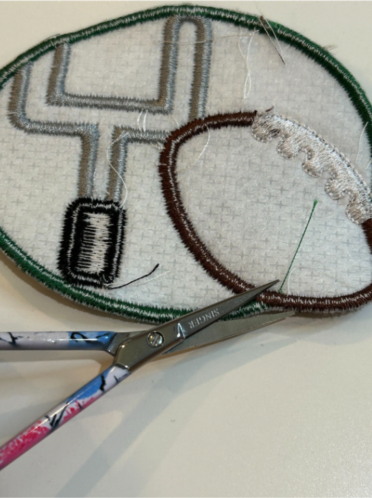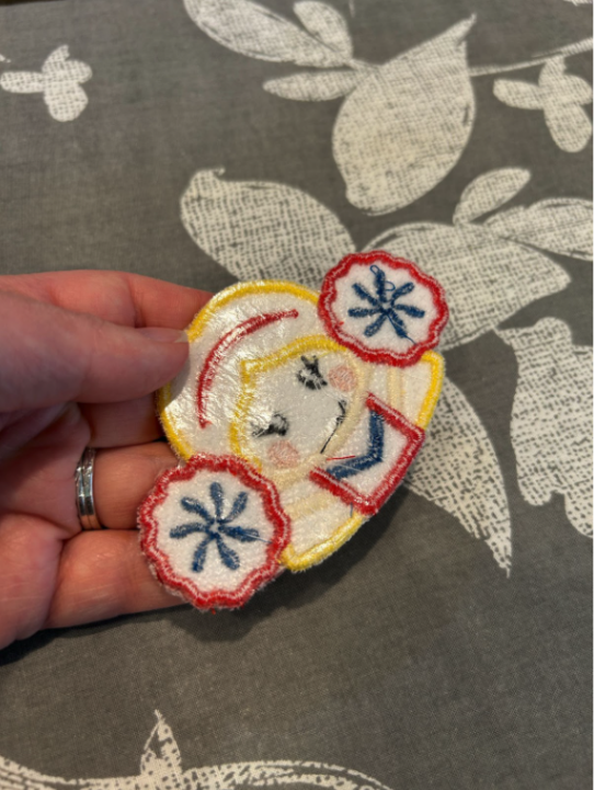 Remove the patches from the hoop. If you cut the felt before (like I did with the cheerleader) you can just tear it from the stabilizer. If you didn’t, you can cut the patch from the felt close to the stitches.