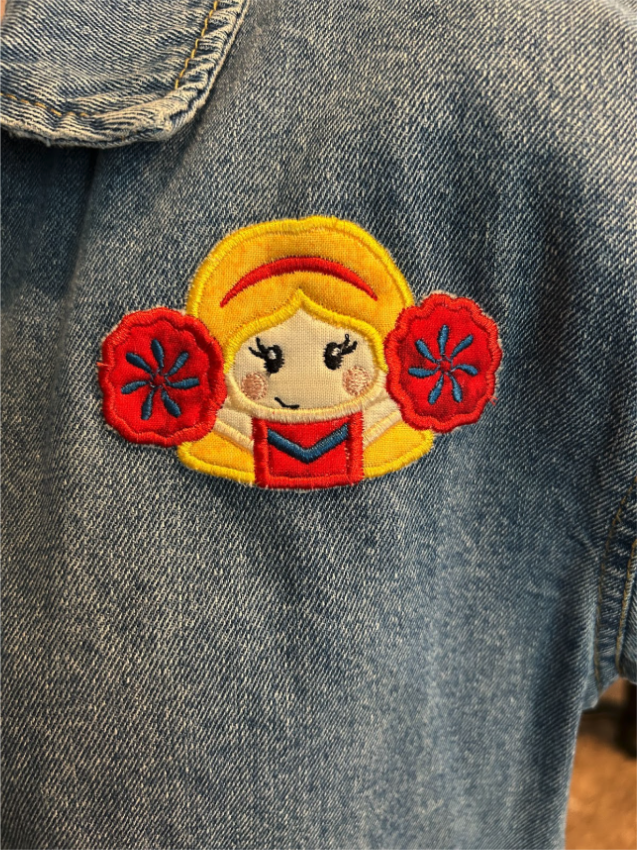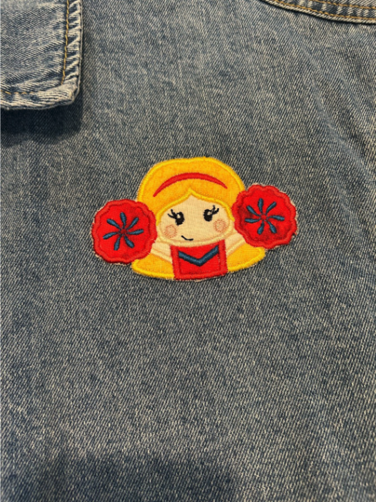 Cycle through the steps of applique and finish out your patches. When I did the cheerleader patch, I found it was a bit easier to cut the felt up next to the patch before I did the cover stitches.