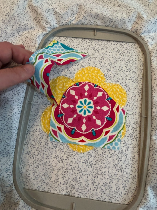 Cover with your fussy cut fabric. If you cut it large, it should overlap a small bit on each edge. Stitch your tack-down stitch next. Trim the fabric if you need to.