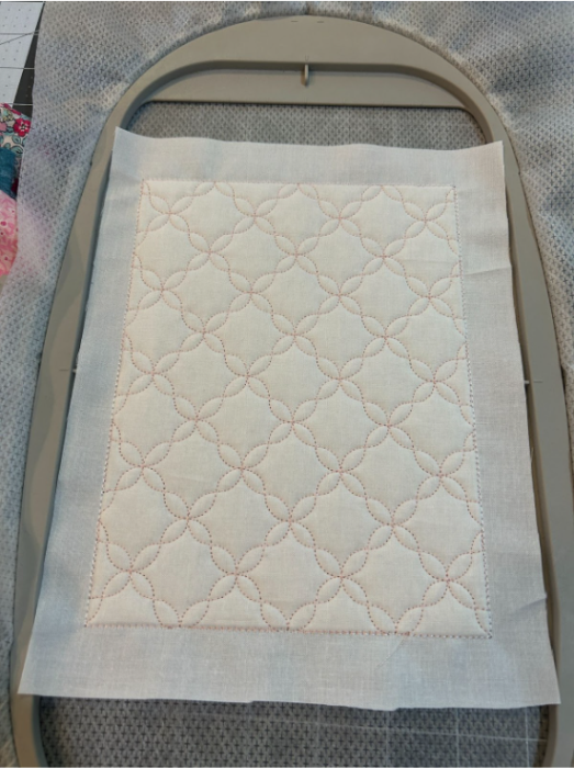The next steps will tack down the background and stitch the design stitches. If you’re new to quilting backdrops, check out our in-depth blog post on how to be successful with them here.