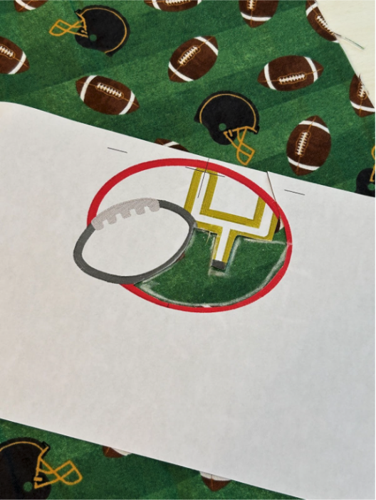 For the field on the football patch, I had a piece of fabric that had footballs on a field. I used my window and found a piece of the fabric that was grass. I traced it and cut it out.