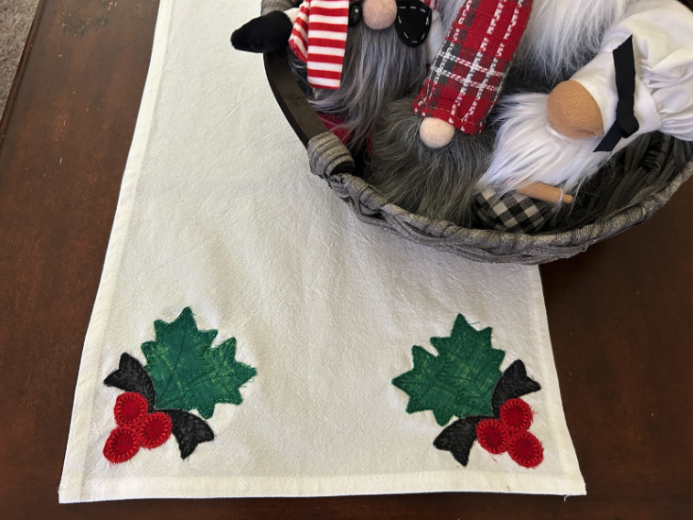 You could also use some memory fabrics and the mirror function on your machine to make matching ends on a table runner for a piece that has meaning for the holidays. Stitch one side of the table runner, mirror the image on your machine, and stitch the other corner.