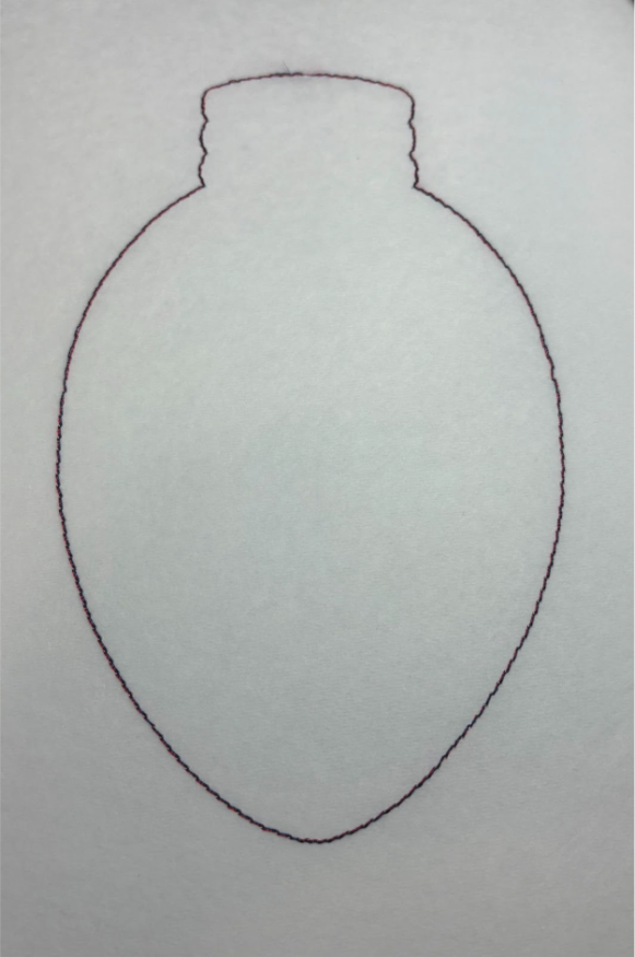 If they are lined up straight and equal distance apart, return to the first step by going back to the beginning of the design. Stitch out the design placement line. Then advance to the pocket line step. This will give you the outline of the ornament along with the pocket alignment as shown. Your personalization should be inside the ornament and below the pocket line.