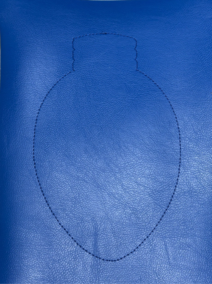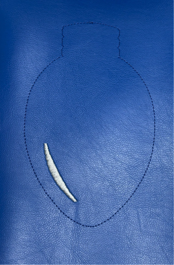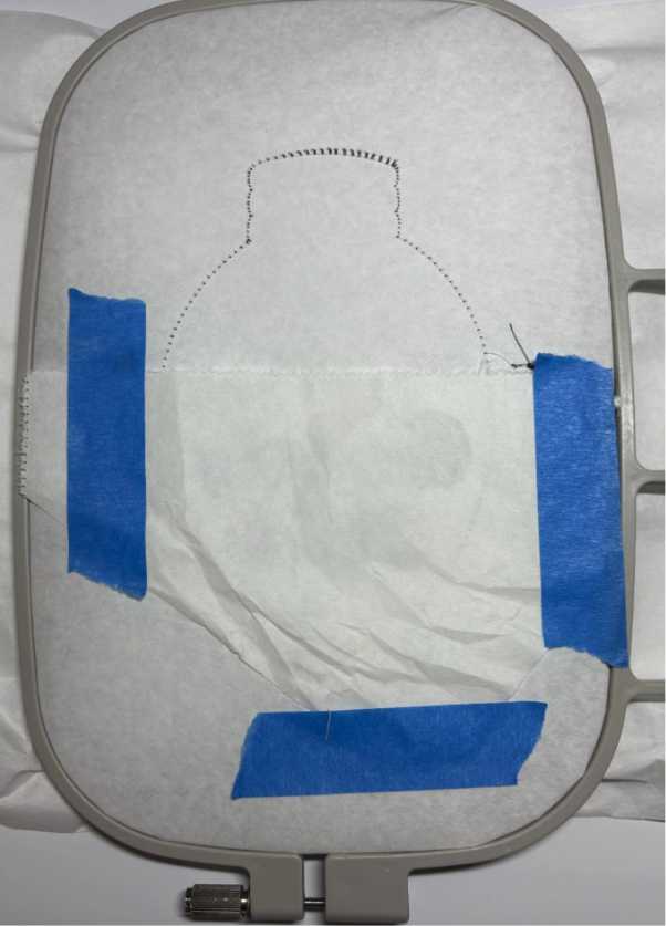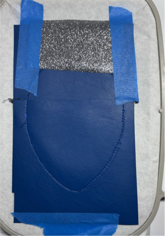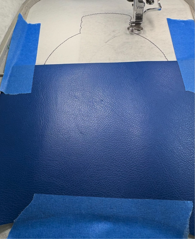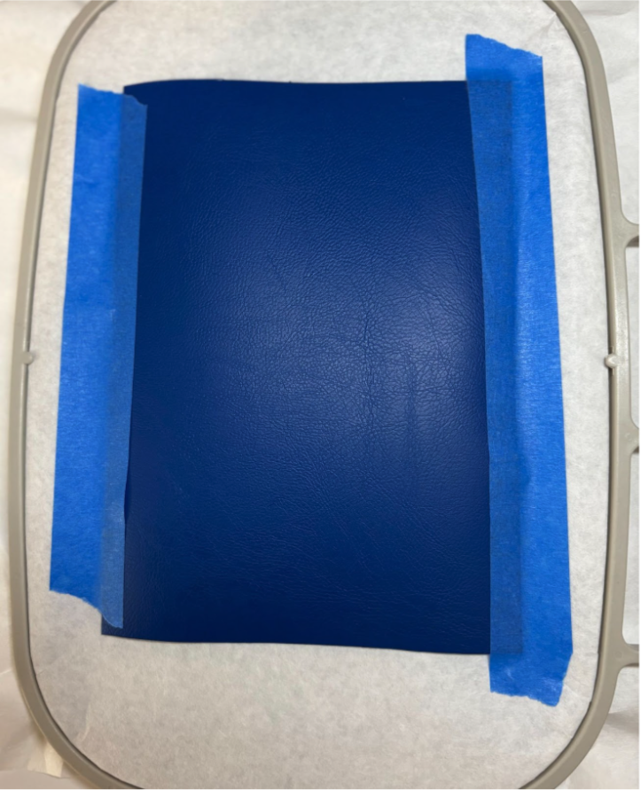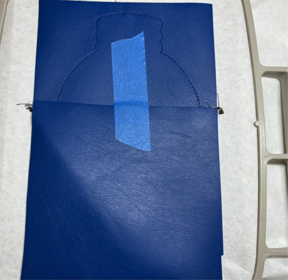 Using the same stabilizer, place your pocket vinyl over the embroidered letters. Align the top with the pocket placement lines and secure it in place with tape.