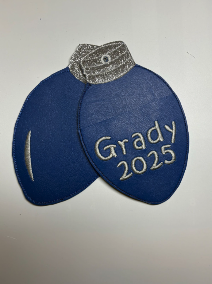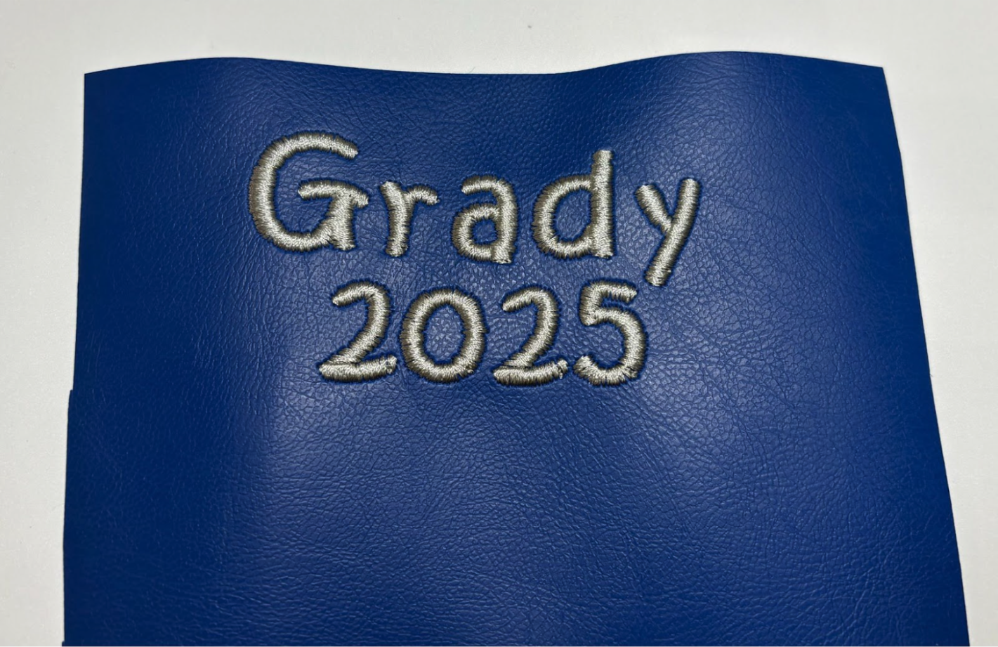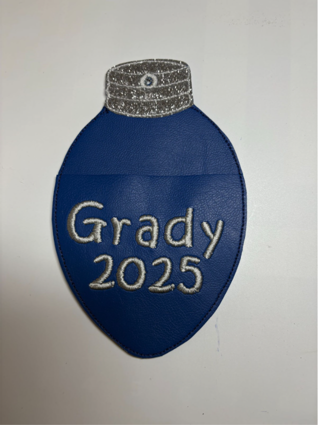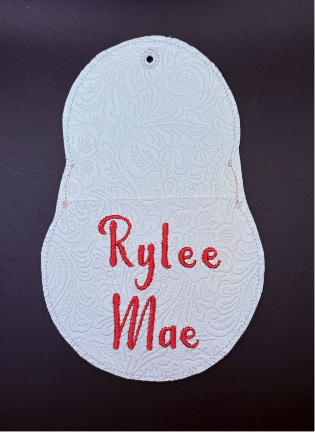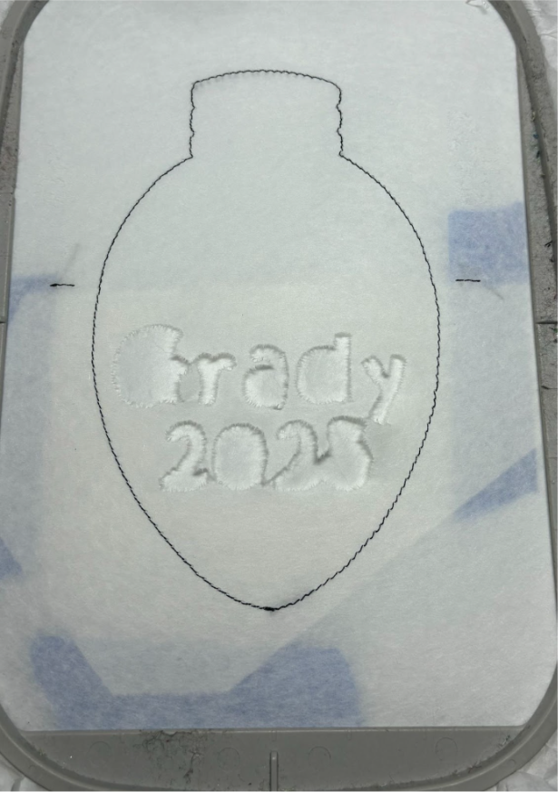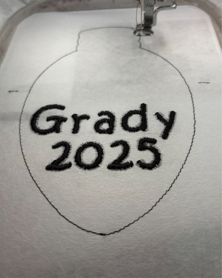 To personalize the back pocket of your ornament, start by loading your chosen design onto the embroidery machine. Add each letter of the name, one by one, and include the year for a special touch. I selected the Ainsley Embroidery Font from Designs by JuJu in the .75” size, but any similar-sized font will work beautifully.