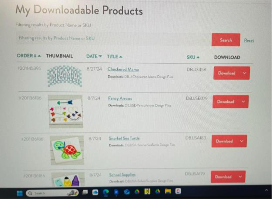 After you have made your purchase at the DBJJ website, select My Downloadable Products. Here you will find all the designs you have purchased. These JuJu designs will remain in your account, so if you ever need to download again, they will still be there. Select the design you wish to download by clicking on the download arrow.