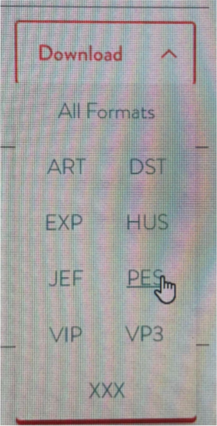 The next screen to appear will be all the formats the designs come in. The brand of machine you have will determine which format you need to download. Refer to your machine’s manual for this information. I have a Brother machine and it reads PES, so I am going to right-click on PES as shown. This will download a .zip file to my computer.