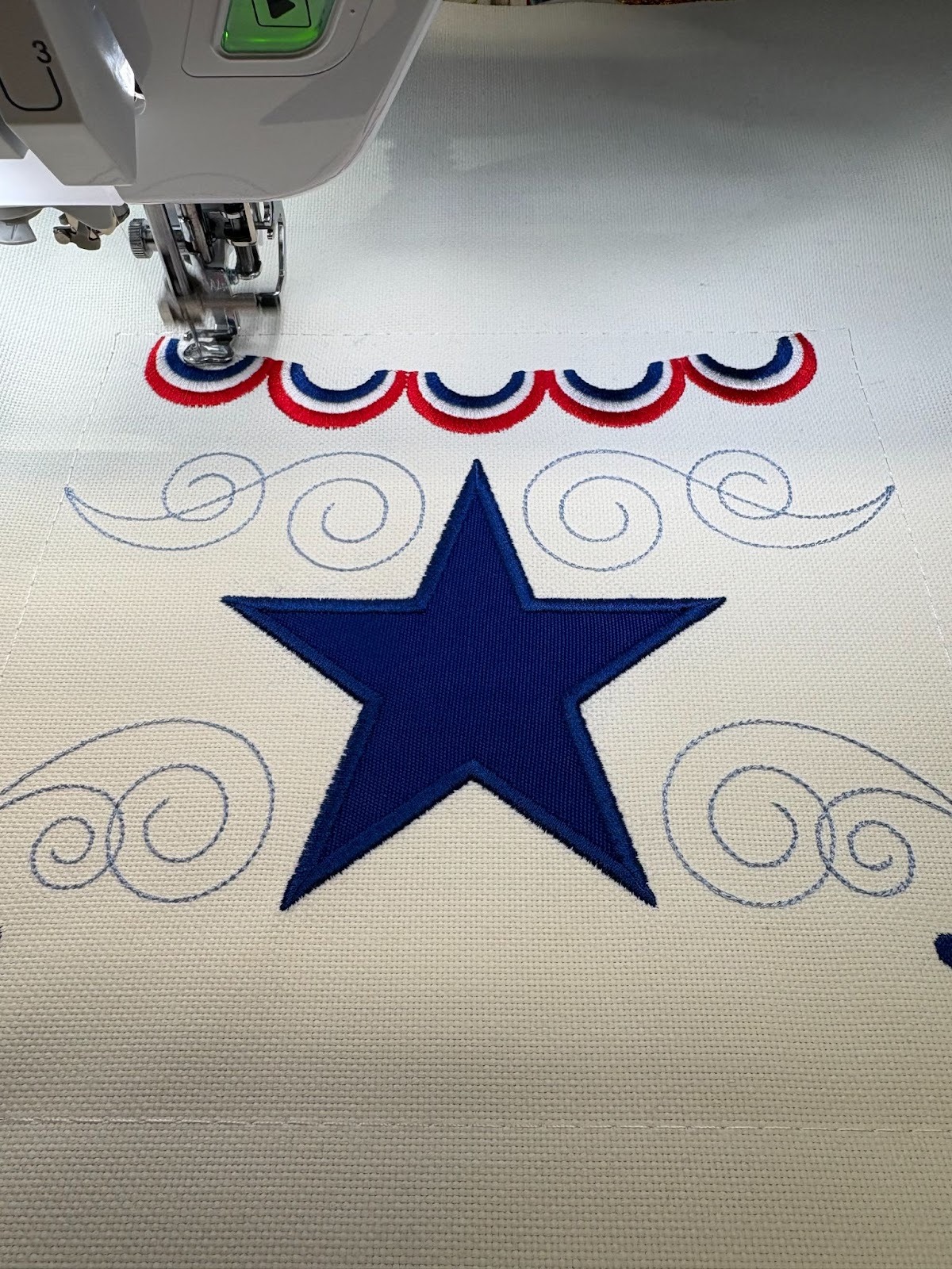 I stitched out the other side of the flag the same way as the first, using the Old Glory design from Set 4. Some of my color choices for both sides were made keeping in mind that the flag will be viewed from a distance compared to a pillow that you would see up close. I didn’t want the swirls and flagpole colors to “disappear,” so I made the flagpole a dark silver and the swirls a darker blue so they would still be seen from farther away.