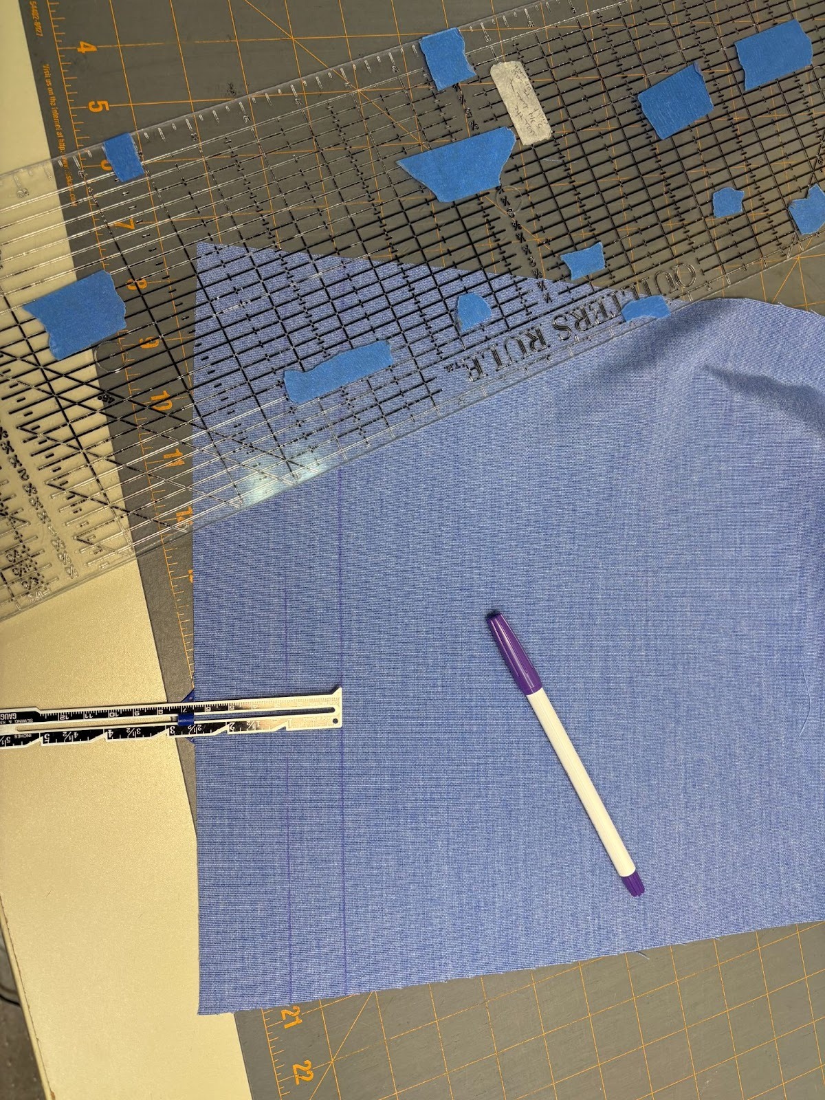The next step was giving the flag a good press. The seams were tending to roll in, so I had water at hand to dampen my fingers and grip the fabric better. Once everything looked good, I needed to sew the line for the casing. I wanted the casing to be 2½”, but my machine doesn’t have a marking that far out. So I measured and put down a strip of painter’s tape to use as my guideline and stitched the casing line.