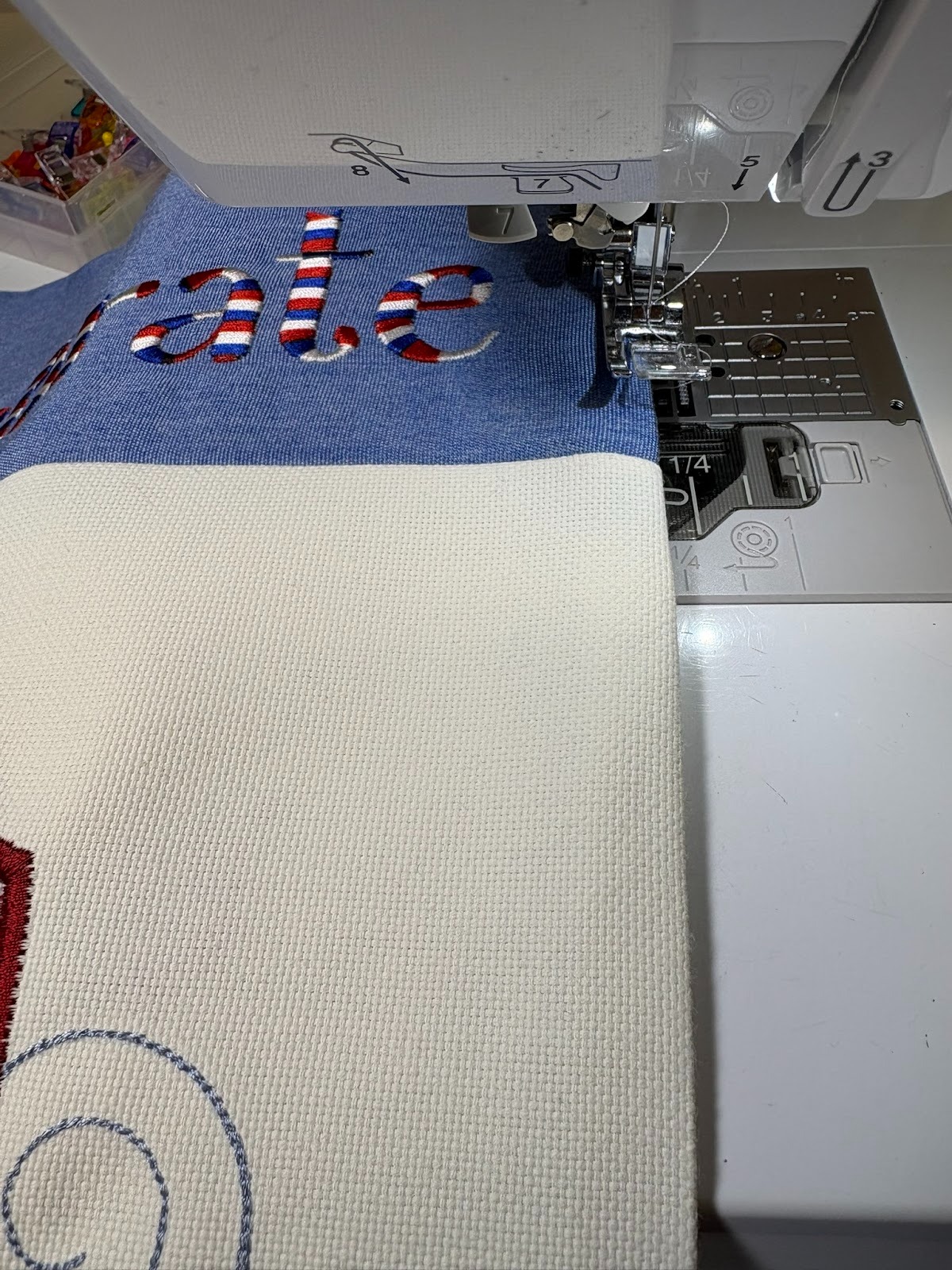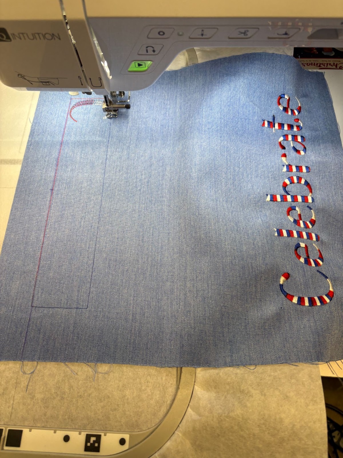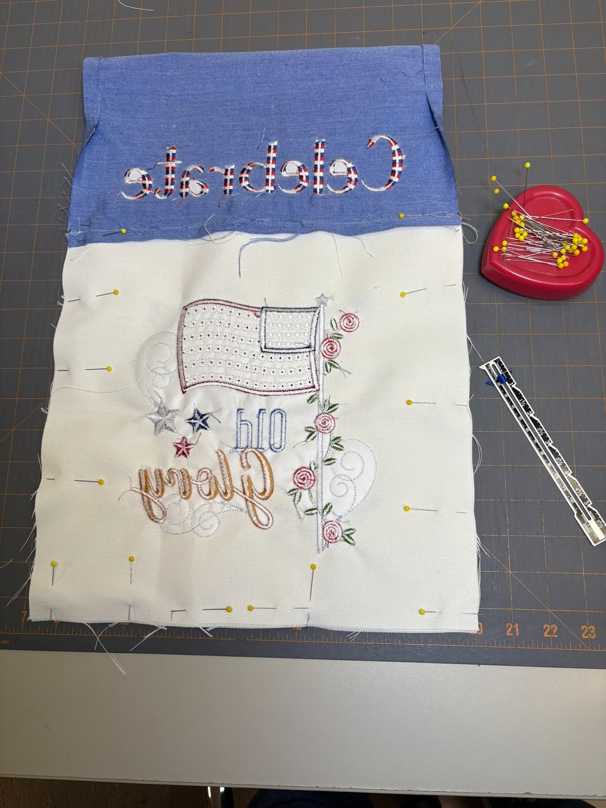 The top body of my flag is made from one piece of fabric, 13” wide x 14” long. I wanted to embroider Celebrate on each short end. I marked 1½” from the bottom of both short sides. That gives me the ½” seam allowance needed plus leaves a 1” space below the word Celebrate. I marked the 1½” line with my disappearing marker, which was useful for checking placement, and embroidered the words using the variegated red, white, and blue thread.