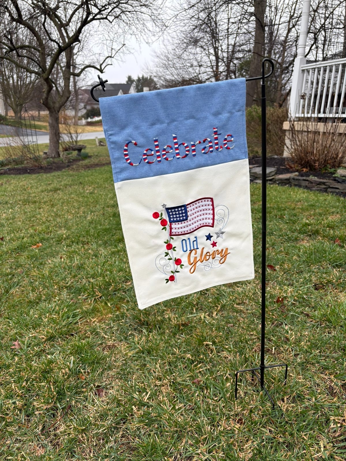 My flag is ready to wave in celebration of our country’s 250th birthday! Right now it’s a great spot of color in my garden that’s just waking up for spring. I hope to see your garden flags and projects made with our Star Spangled Stitches designs!
