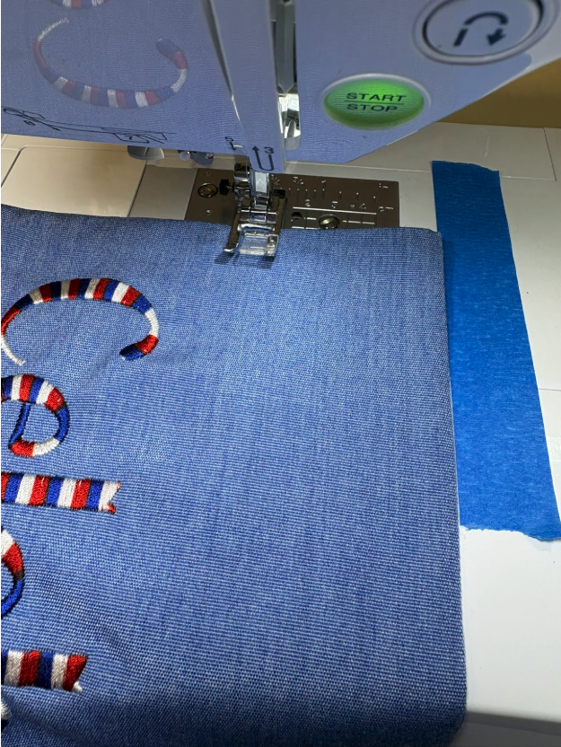 The next step was giving the flag a good press. The seams were tending to roll in, so I had water at hand to dampen my fingers and grip the fabric better. Once everything looked good, I needed to sew the line for the casing. I wanted the casing to be 2½”, but my machine doesn’t have a marking that far out. So I measured and put down a strip of painter’s tape to use as my guideline and stitched the casing line.