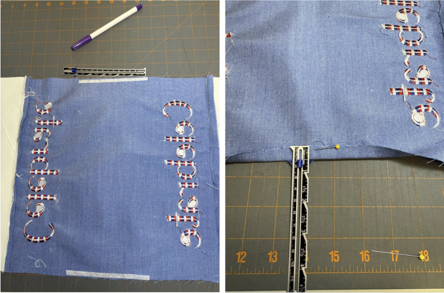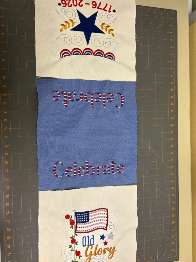 The top body of my flag is made from one piece of fabric, 13” wide x 14” long. I wanted to embroider Celebrate on each short end. I marked 1½” from the bottom of both short sides. That gives me the ½” seam allowance needed plus leaves a 1” space below the word Celebrate. I marked the 1½” line with my disappearing marker, which was useful for checking placement, and embroidered the words using the variegated red, white, and blue thread.