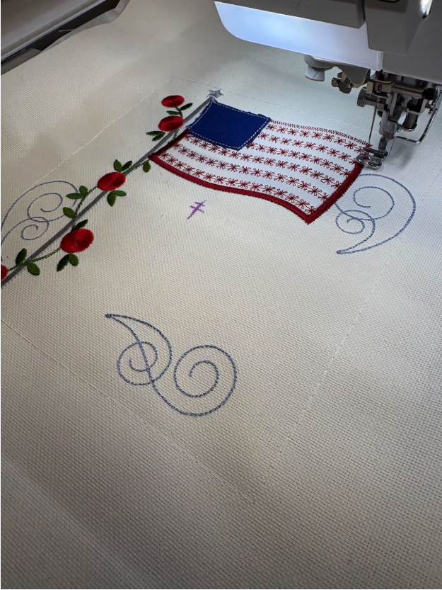 I stitched out the other side of the flag the same way as the first, using the Old Glory design from Set 4. Some of my color choices for both sides were made keeping in mind that the flag will be viewed from a distance compared to a pillow that you would see up close. I didn’t want the swirls and flagpole colors to “disappear,” so I made the flagpole a dark silver and the swirls a darker blue so they would still be seen from farther away.