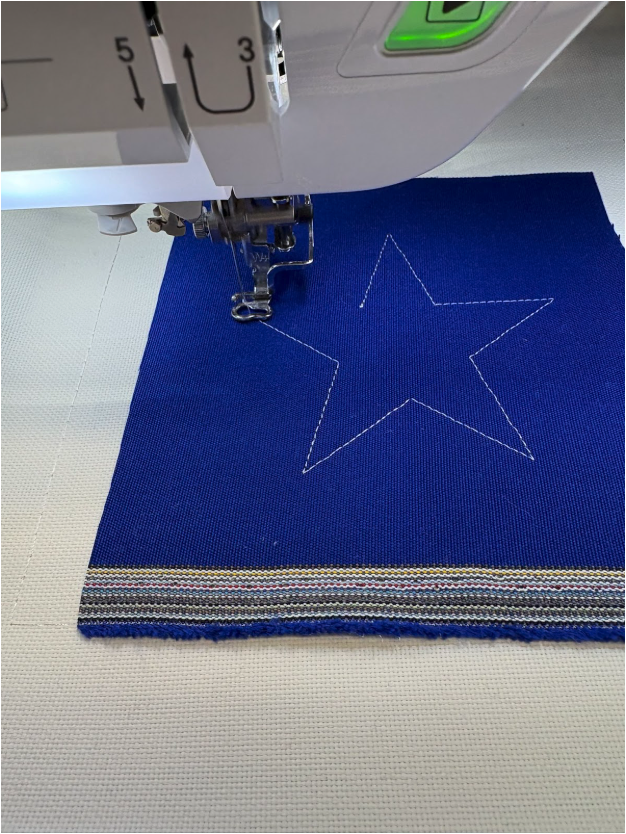 I chose the 8” x 8” Star 1776 design from Set 2 for the first side of the flag. With a finished flag width of 12”, this leaves about a 2” space on each side of the design. I used Embrilliance to delete the first three steps of the design—the placement and tack-down lines—because I’m not making a quilt block. If you aren’t able to delete the steps, you can skip them during your stitch-out. Basting boxes help prevent puckering, so I almost always add them to any design I’m embroidering. I used Designs by JuJu+ tearEZ Tear-Away Stabilizer in my hoop and floated the fabric with 505® Temporary Adhesive.