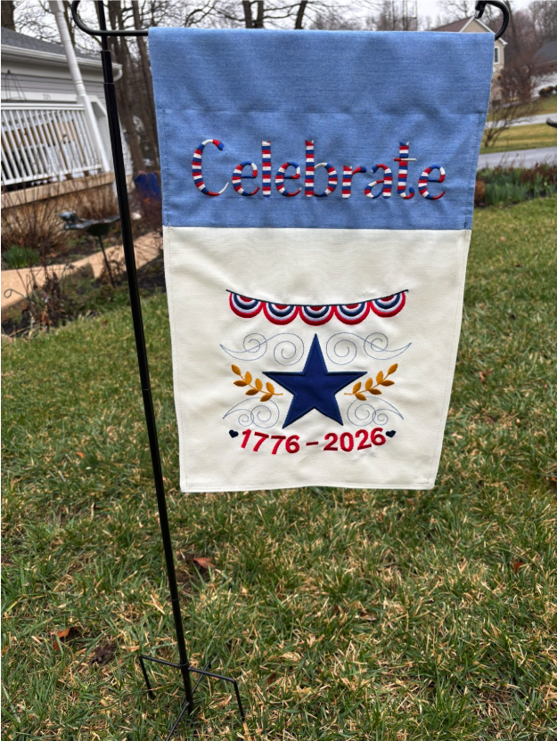 My flag is ready to wave in celebration of our country’s 250th birthday! Right now it’s a great spot of color in my garden that’s just waking up for spring. I hope to see your garden flags and projects made with our Star Spangled Stitches designs!