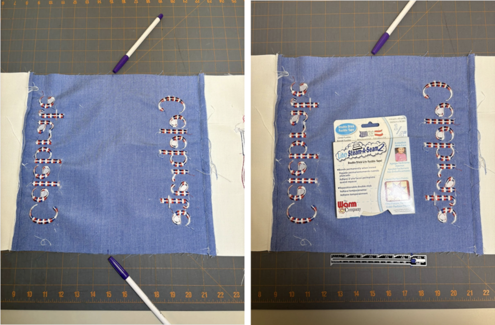 Next, I needed to prep the casing for the flag, which I’m going to make 2½”. I marked the center of each side of the upper body of the flag, and then marked out 2½” to each side of the center marking. In other words, I now had 5” measurements that were centered on each side of the top.Take a look at the photos below to see the marks the pens are pointing to. I then used Steam-A-Seam2® between the marks and folded over a ½” seam on each side and pressed.