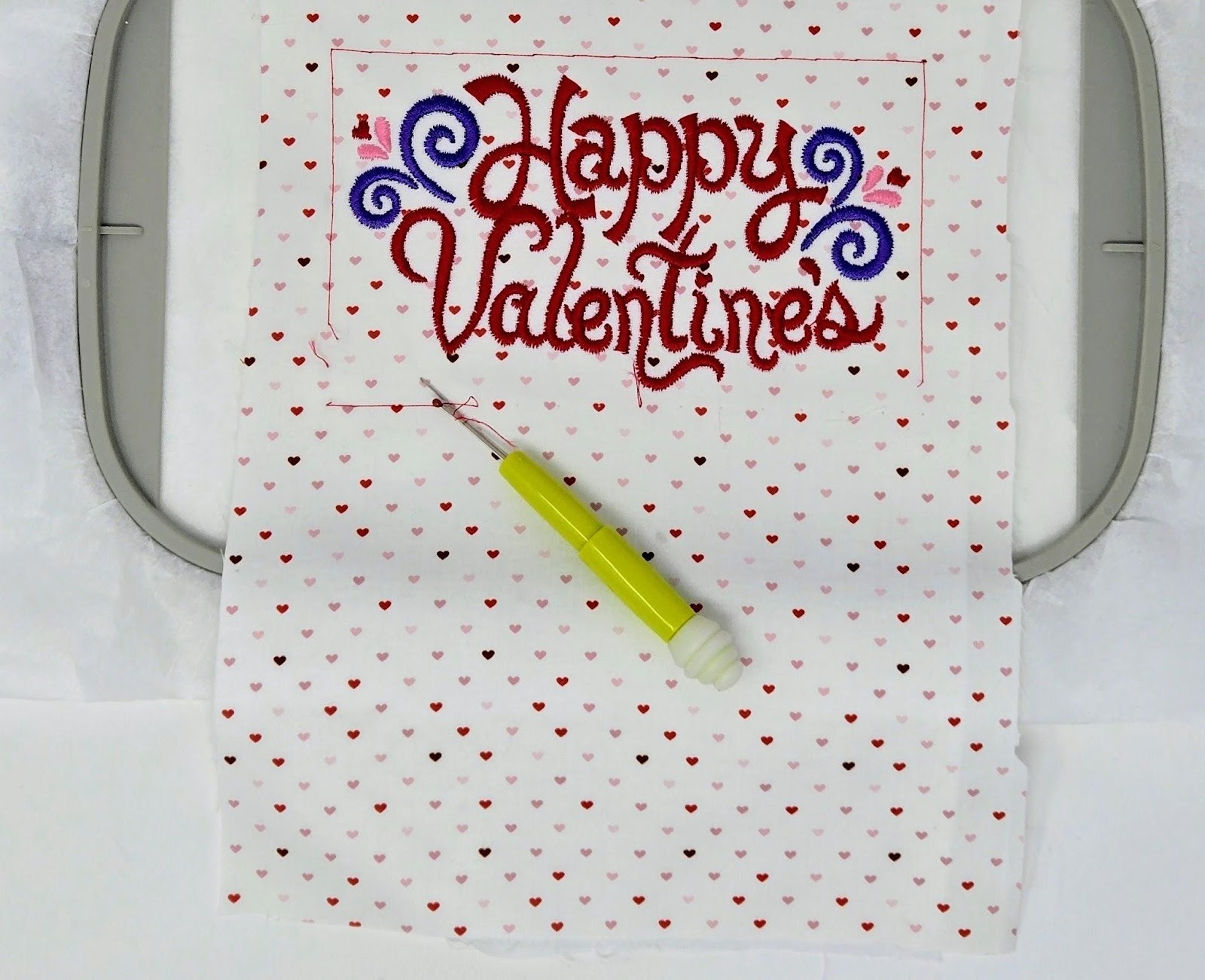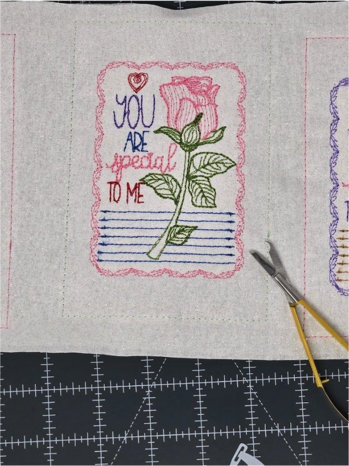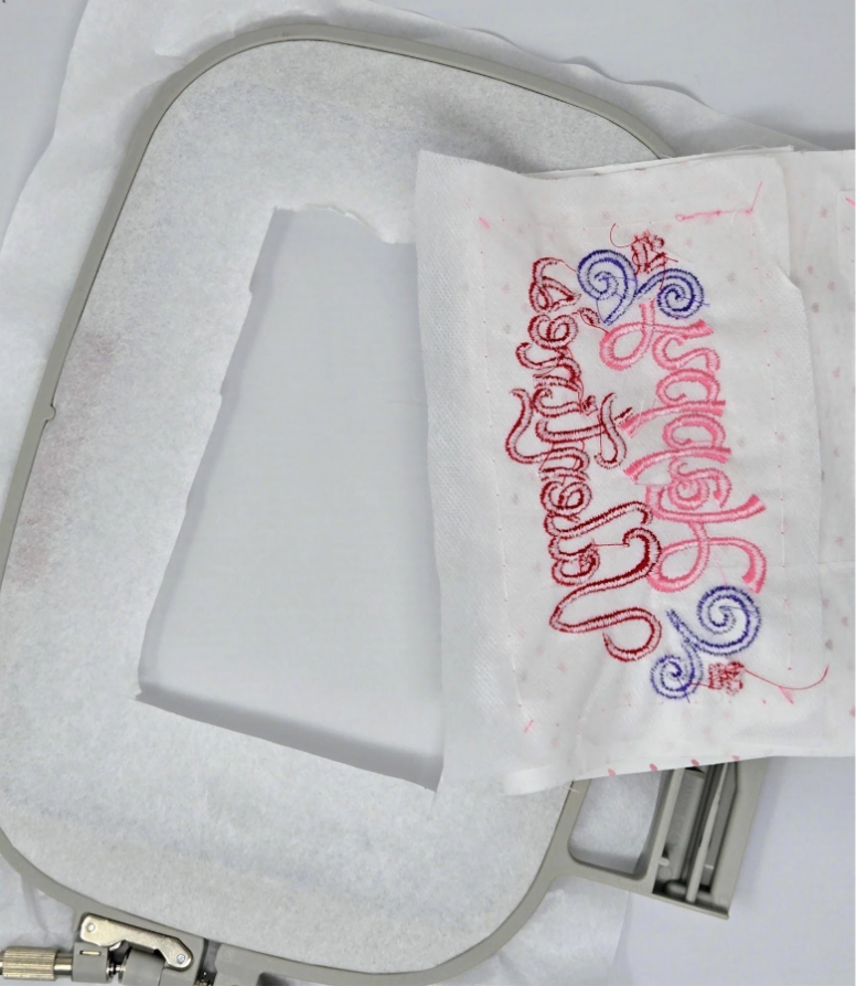 Remove designs from the hoop and gently tear away the stabilizer that you floated on the back. All the rest of the stabilizers can stay in place. Support your stitches with your fingers as you remove the stabilizer. Trim any threads on the back and any jump stitches on the front.