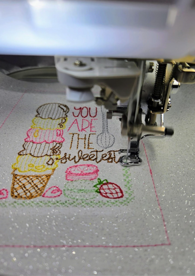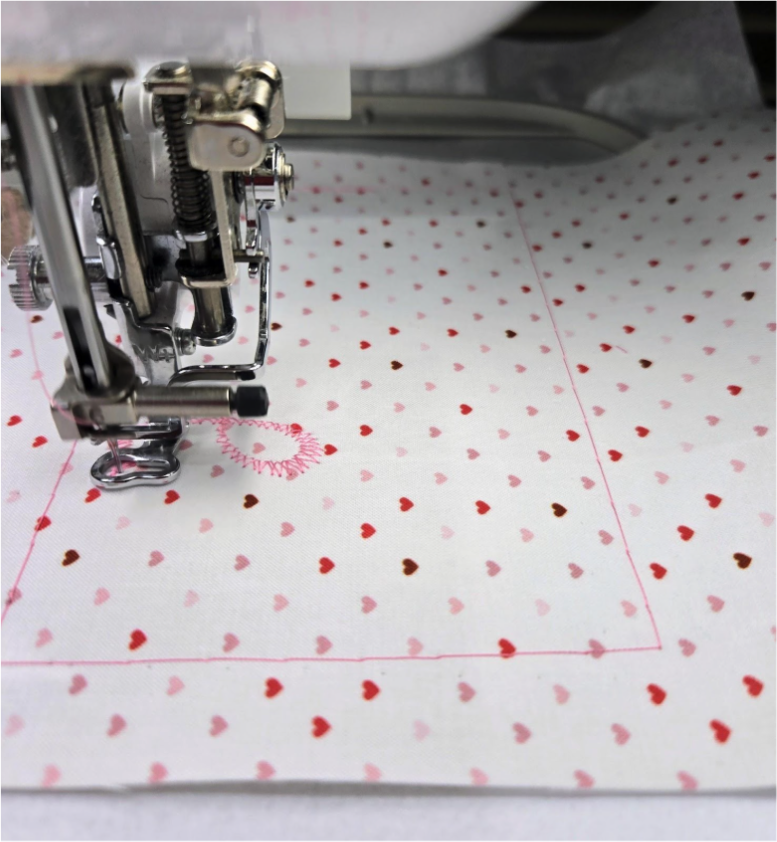 At my machine I pulled up my design, chose my thread colors, and was ready to have some fun! I added a basting box around my design to hold the fabric in place. This is done in the Edit buttons on your machine after you are in the embroidery screen, if you have that capability.
