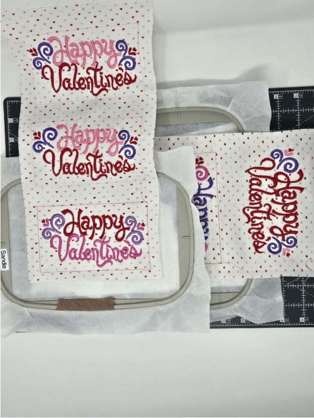 Continue embroidering your designs. This time I left about an inch between each design's placement box. Remove the stabilizer that you floated and cut the windows as above.