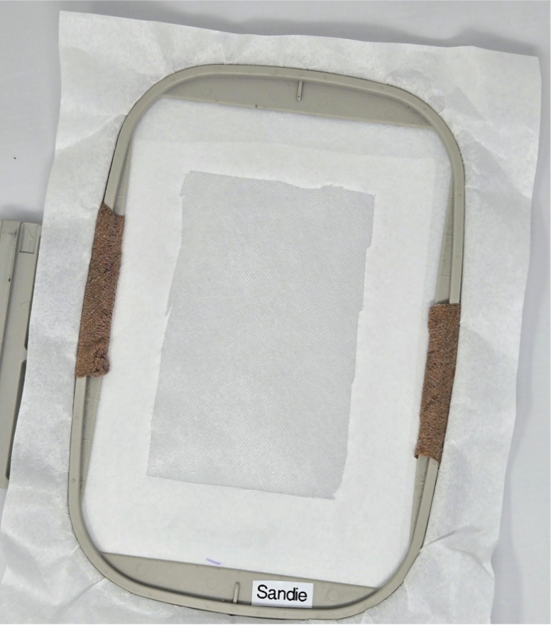 Now cut a piece of sticky-back tear-away stabilizer at least ½” larger than the hole you created. Remove the paper backing and adhere it to the back of the stabilizer already in your hoop. The sticky part will face the front of your hoop.