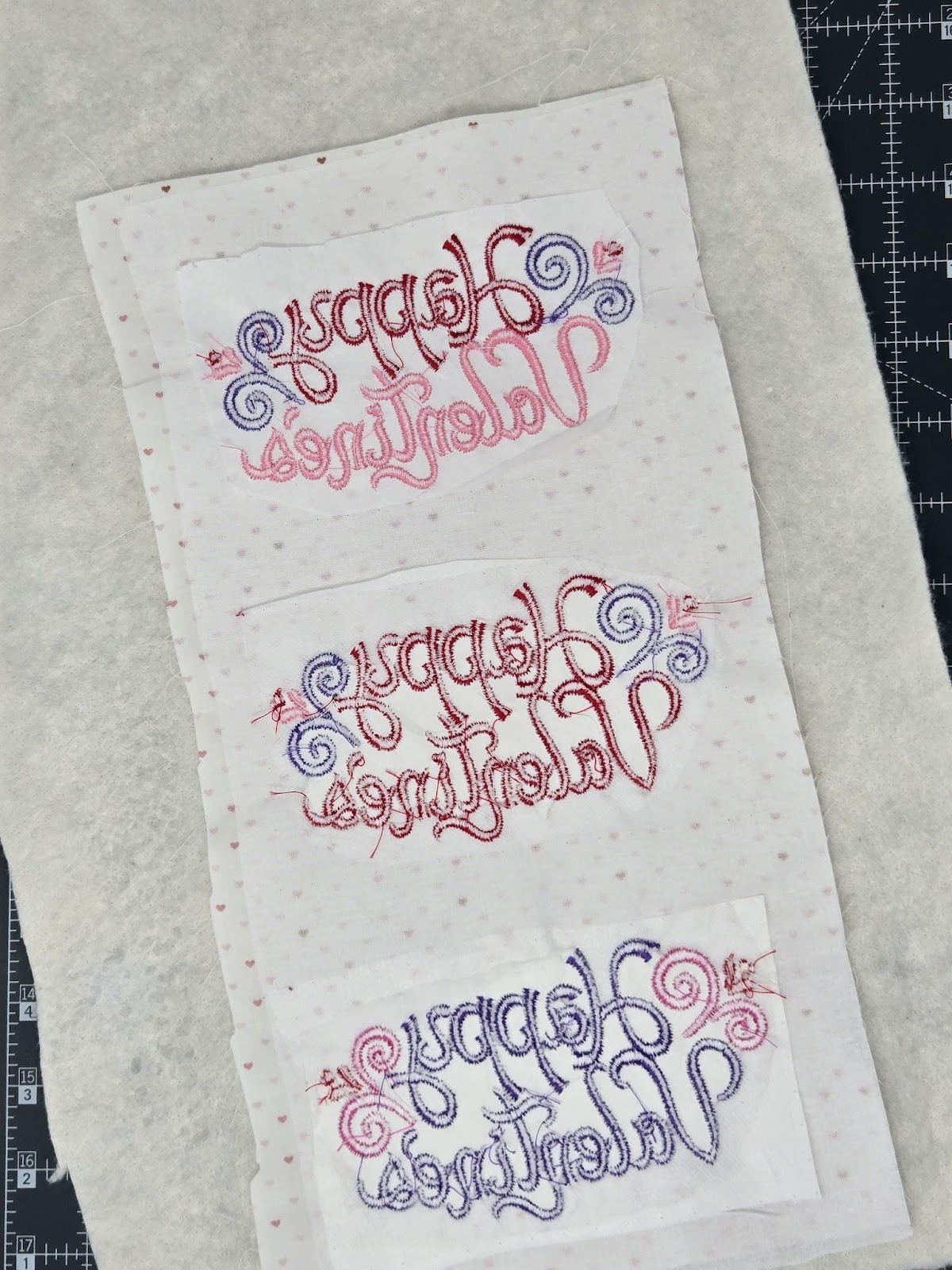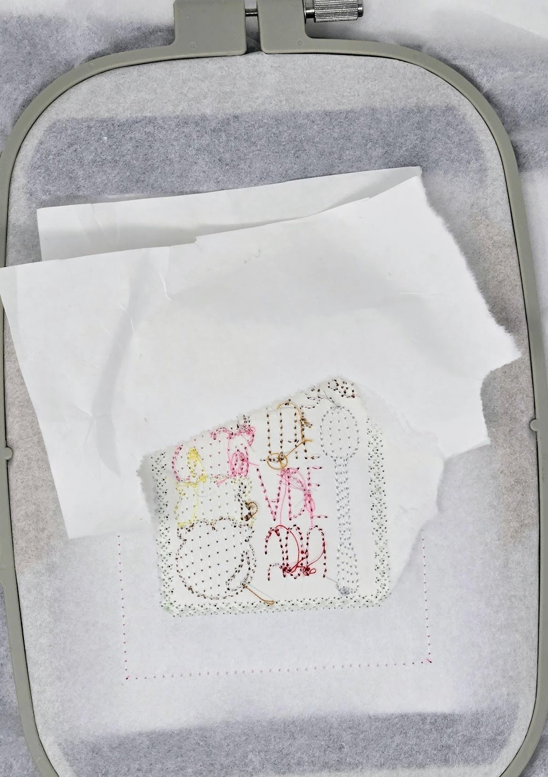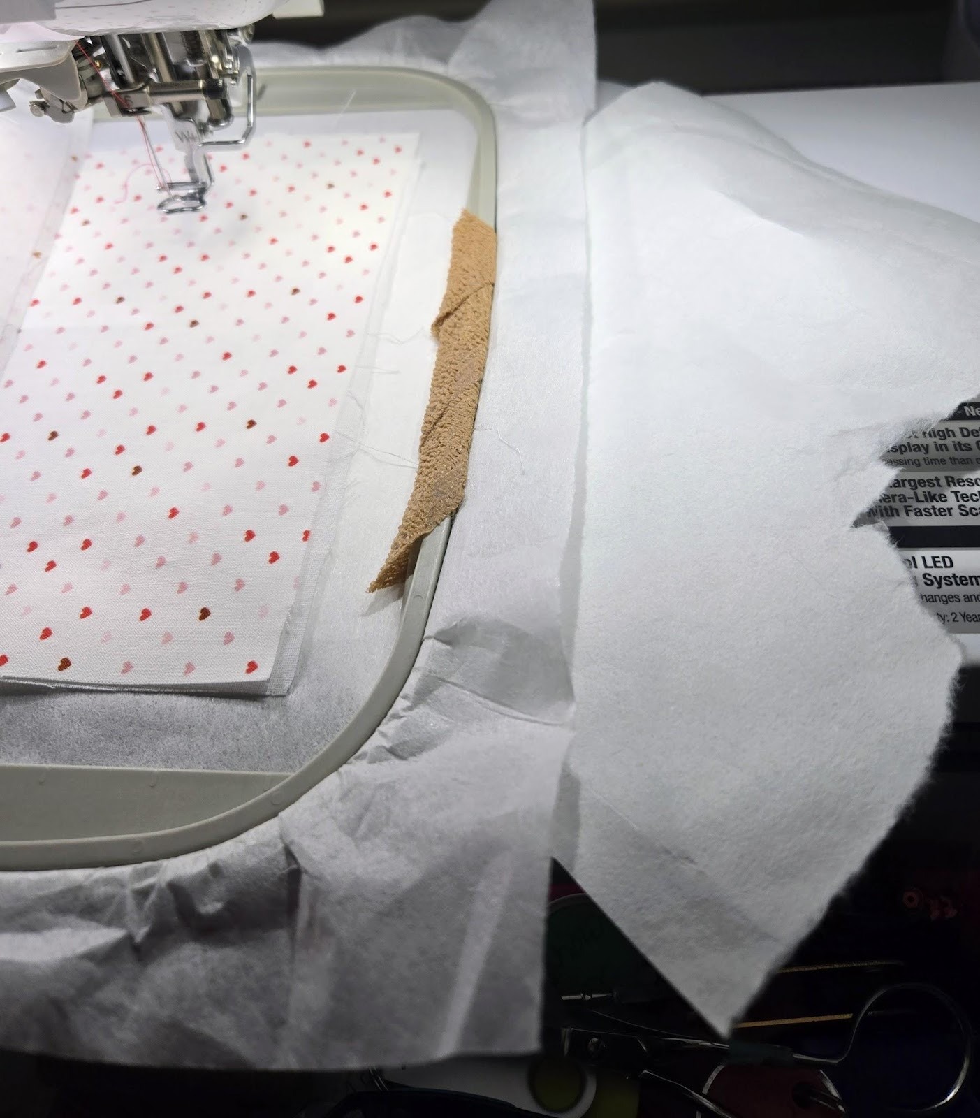 I noticed I needed more stabilization as the first design was stitching out, so for all subsequent designs I slid a scrap of tearEZ under my hoop. These were pieces left over from other projects that I saved beside my machine.