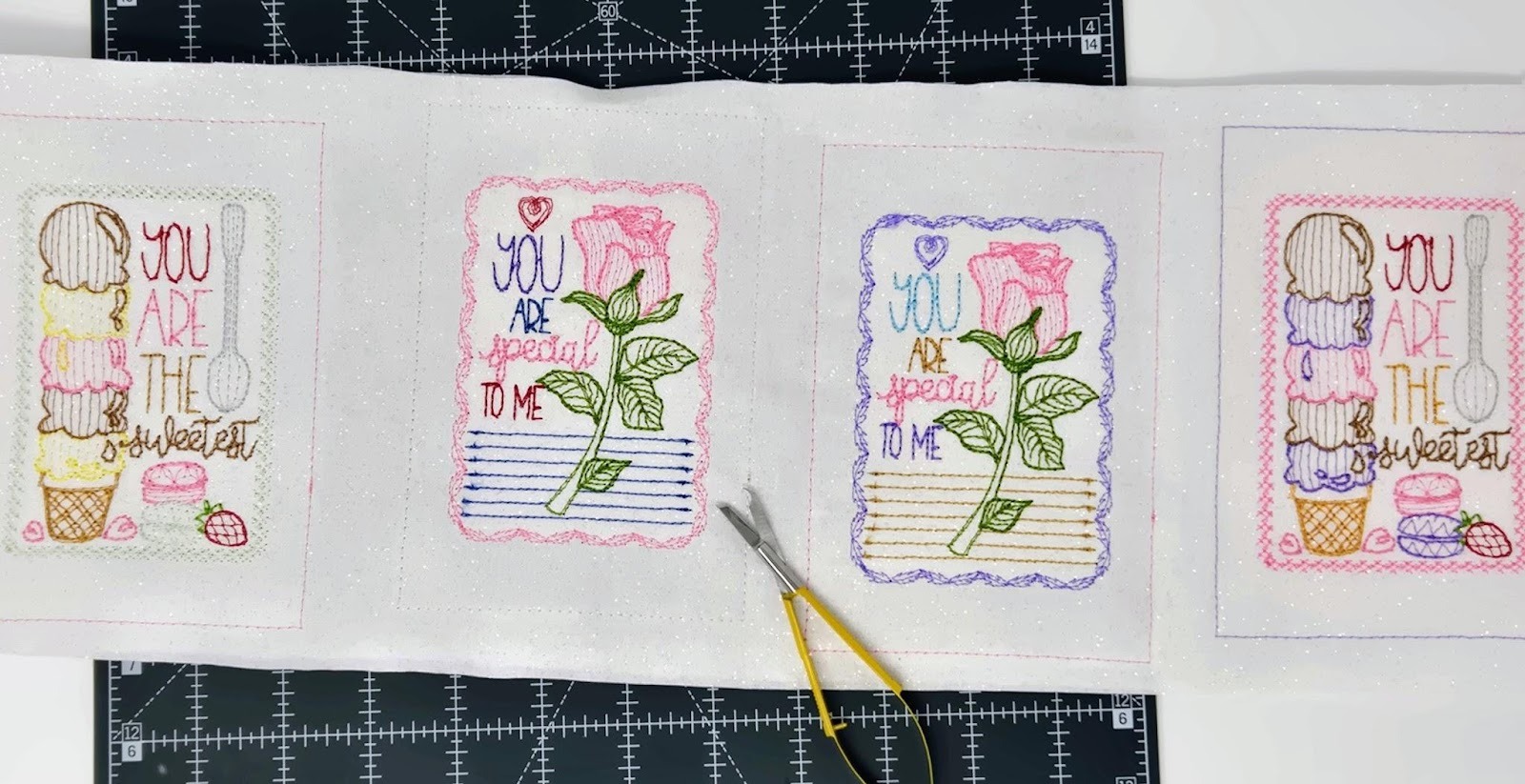 The bright colors are so happy. Making postcards is a super fun and fast project with great results. And the beauty is, they can be made in any size hoop. You can make one design at a time in a 5x7 hoop, or you can add multiple designs to one large hoop, using either the icons on your machine or software. You can also stitch multiple designs with a length of fabric and one hooping of stabilizer, saving time and supplies.! I will show you how.