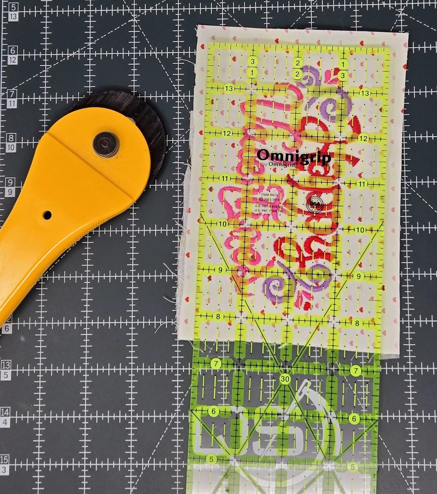 Next, cut apart your designs into 4” x 6” postcards, centering the ruler over the designs. This time I used a 4”-wide ruler.
