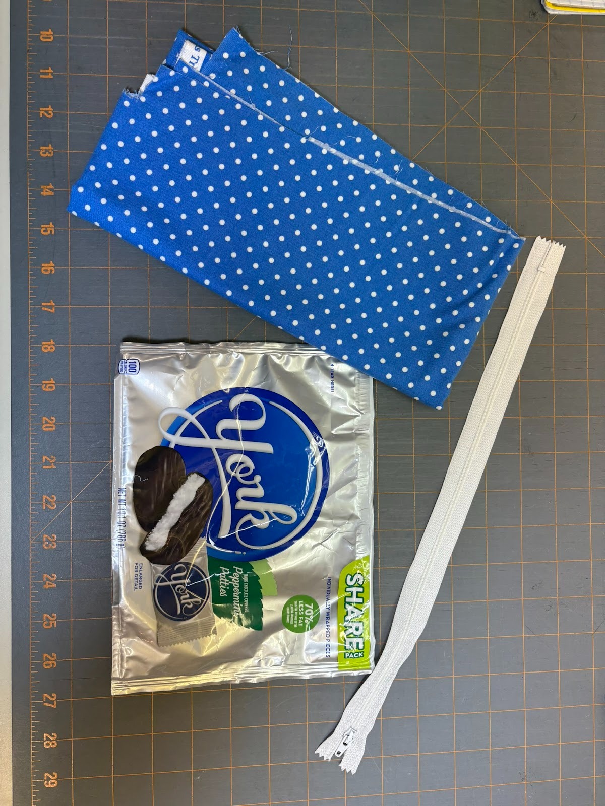 Choose a candy or snack bag that is large enough to cut the required front pieces. For this sample, the 5x7 zippered bag is made from a York Peppermint Patties package, using the package for the front and fabric for the back. Again,I think it will be too difficult to turn right side out at the end if both sides are made from the bag. For the 5x7 bag, I’ll need to cut a piece that is 6” (height) x 8” (width).