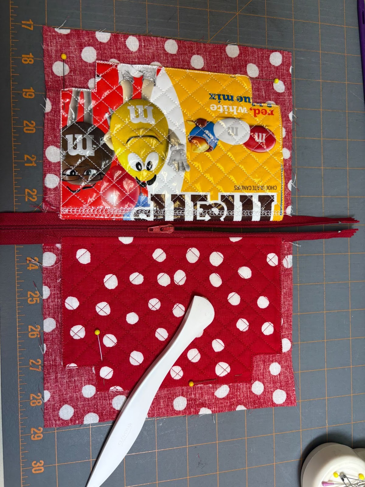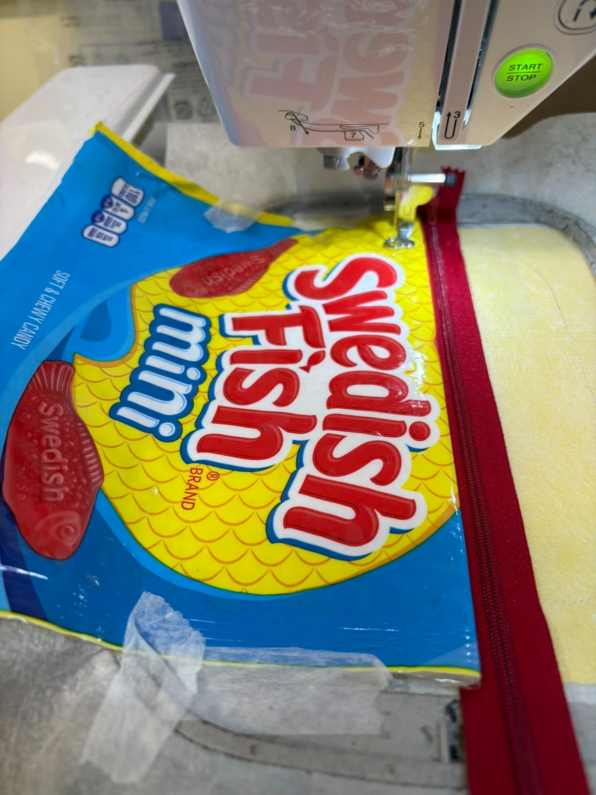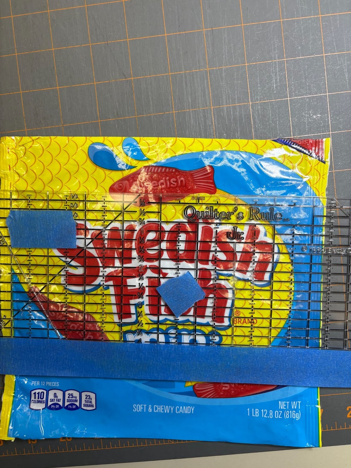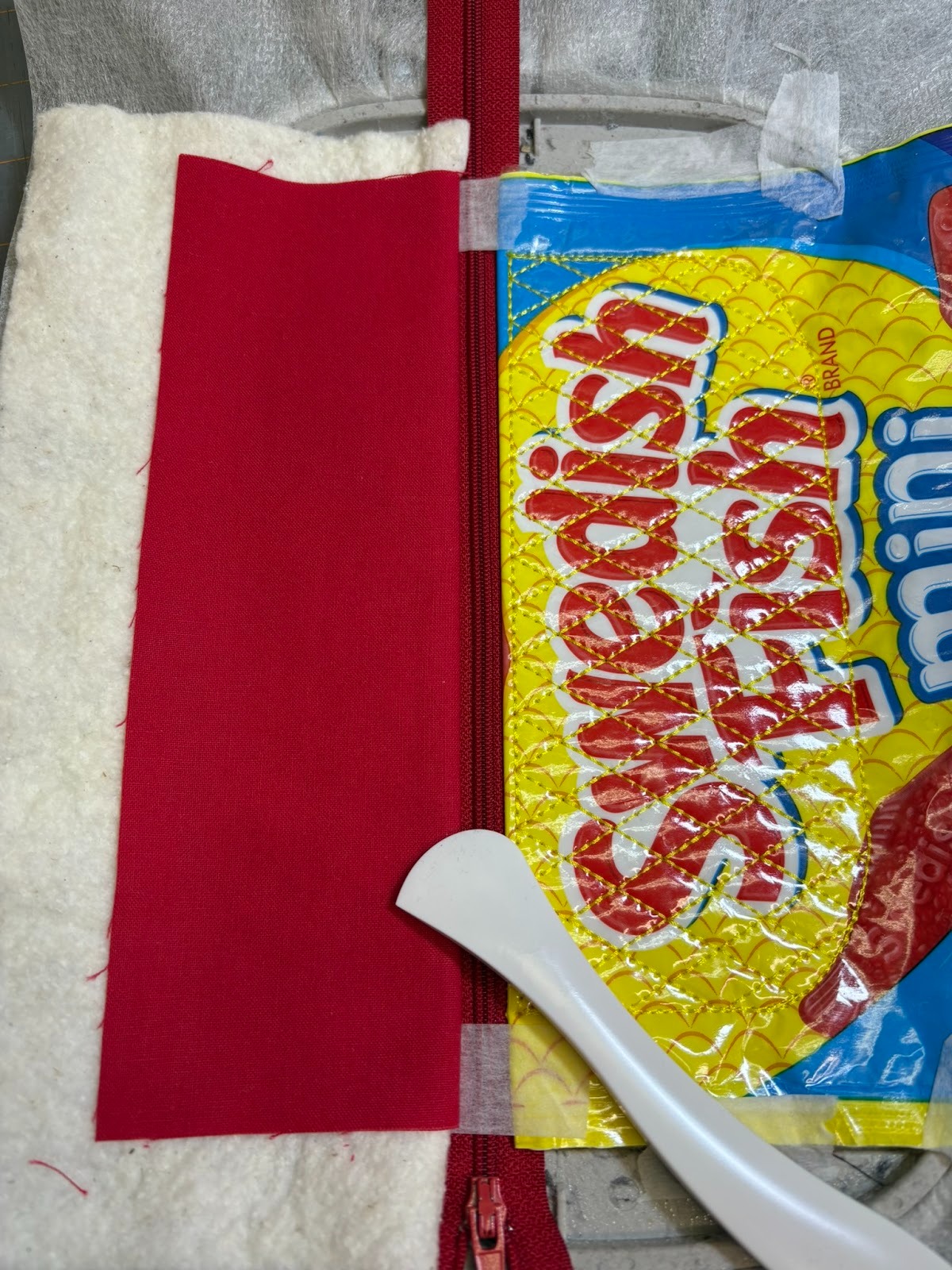 I wanted to make sure that the words Swedish Fish would be on the bag, so I used my clear ruler to center the words within the 4” needed from top to bottom. Then, since Step 2 shows that the top of that 4” piece will be aligned with the zipper edge, I cut off the top of the bag. If you notice in my photo, I didn’t bother to cut the rest of the bag off at that time.