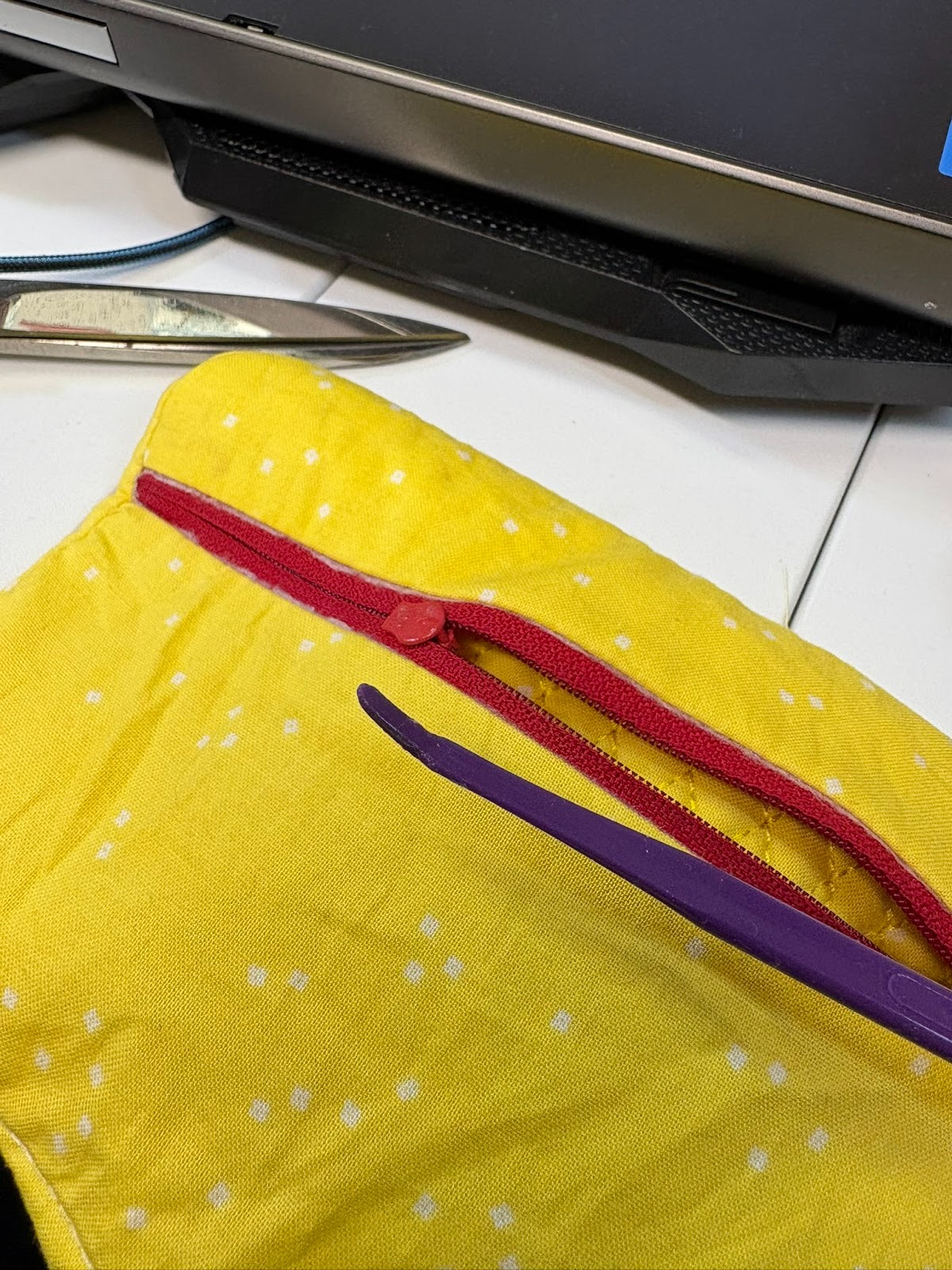 When you sew the opening closed, make sure you catch only the lining fabrics together—don’t poke in so far that you are catching the outside fabrics. Then use the curved end of That Purple Thang and push the zipper all the way open so you can turn the bag right side out.