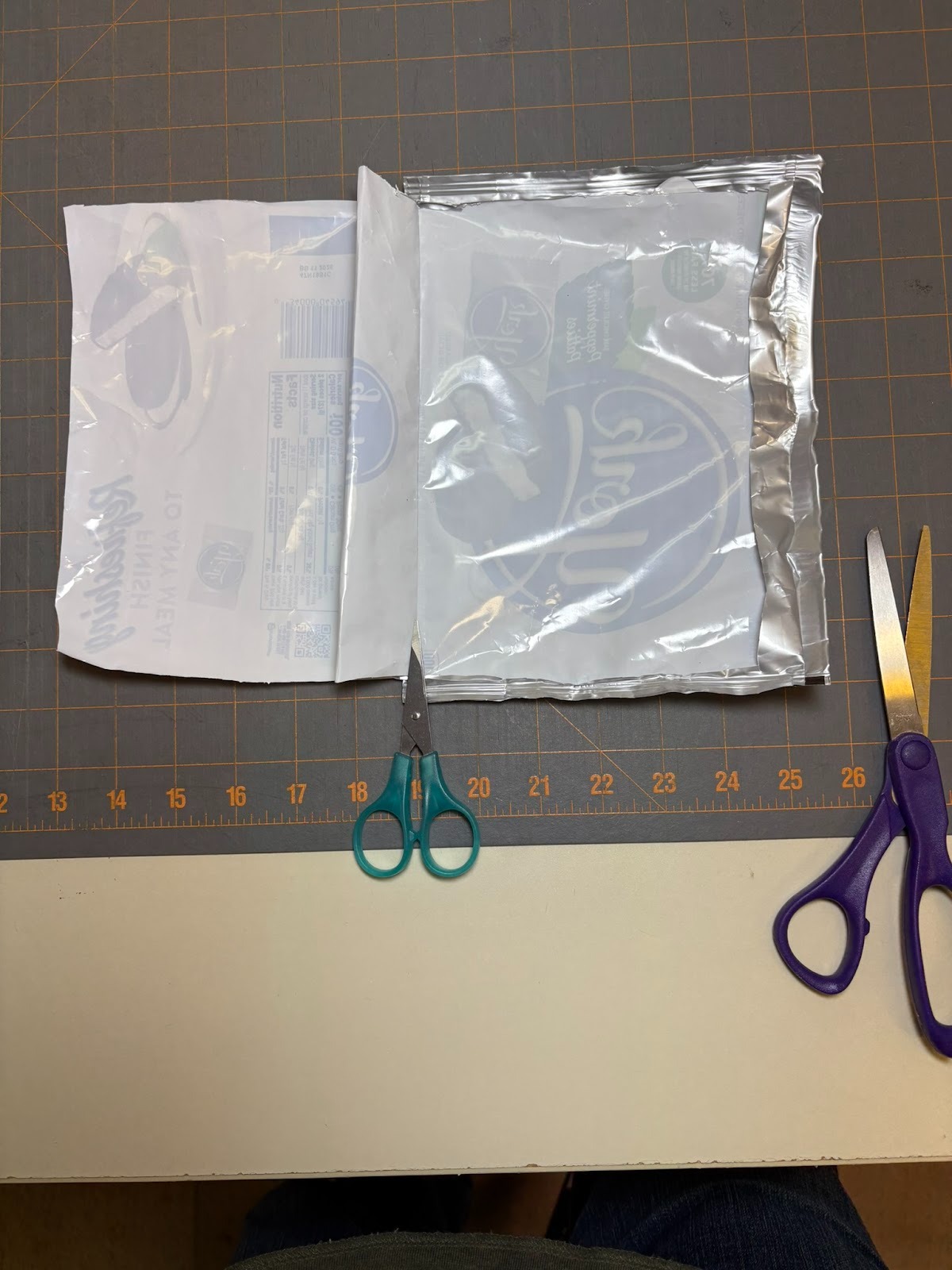 Make sure you wash and dry the candy or snack bag before you start your project. Then carefully cut open the bag and lay the front flat.