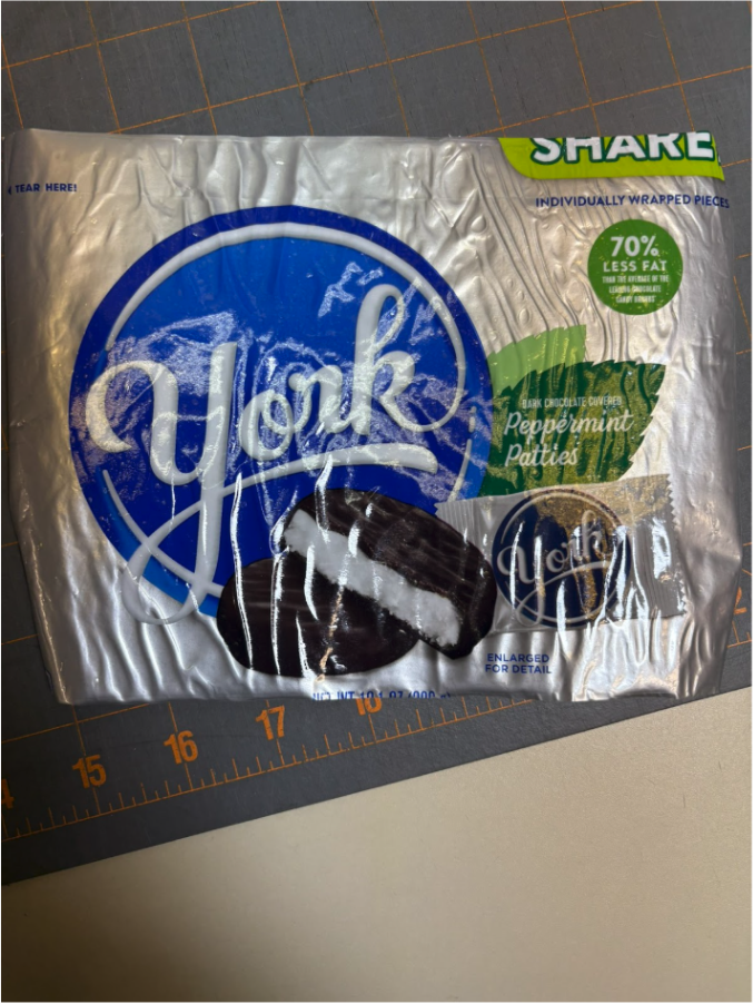 Choose a candy or snack bag that is large enough to cut the required front pieces. For this sample, the 5x7 zippered bag is made from a York Peppermint Patties package, using the package for the front and fabric for the back. Again,I think it will be too difficult to turn right side out at the end if both sides are made from the bag. For the 5x7 bag, I’ll need to cut a piece that is 6” (height) x 8” (width).