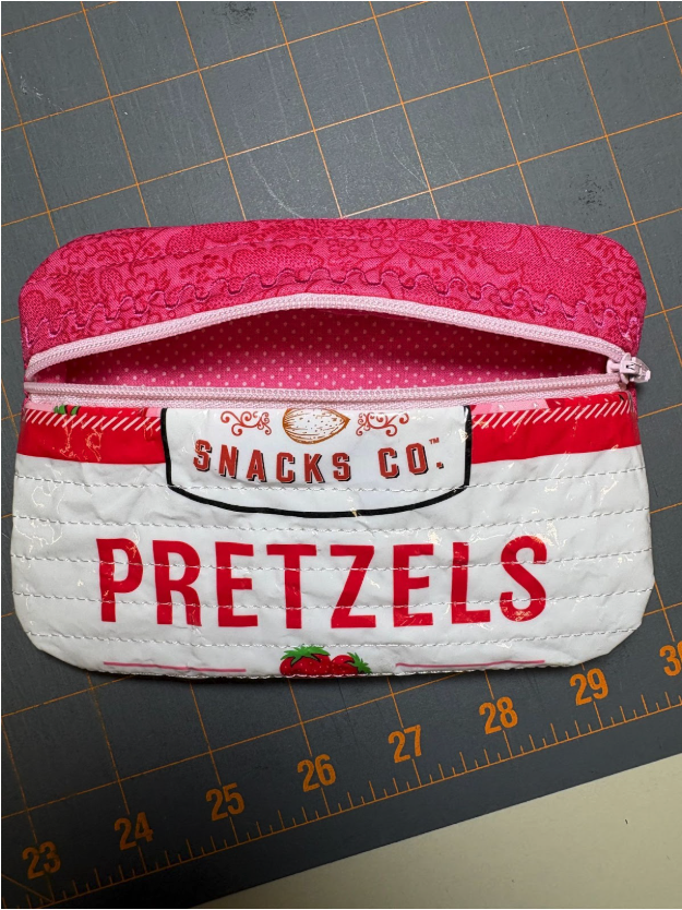 A word of advice: Hide the bags that you’re planning to use after you purchase them. After buying a package of Cheetos, I thought would make a cute zippered bag. I opened the bag carefully and ate a few, planning to spend a few days eating them before making the bag. Later, I turned around and my husband was eating them! I told him that I needed the bag and to be careful and save it for me. He did, but with a tear right down the middle. Guard your bags!