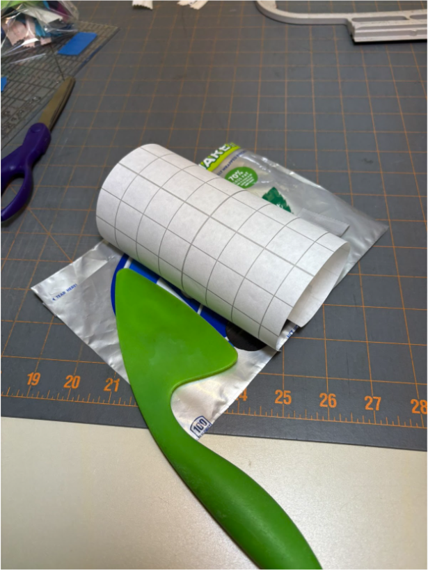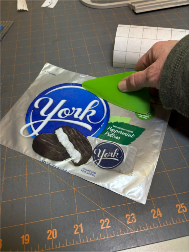 Using a tool from my kitchen as a squeegee—I think it’s a frosting spreader—I made sure the vinyl was fully in contact with the candy bag and there were no air bubbles.