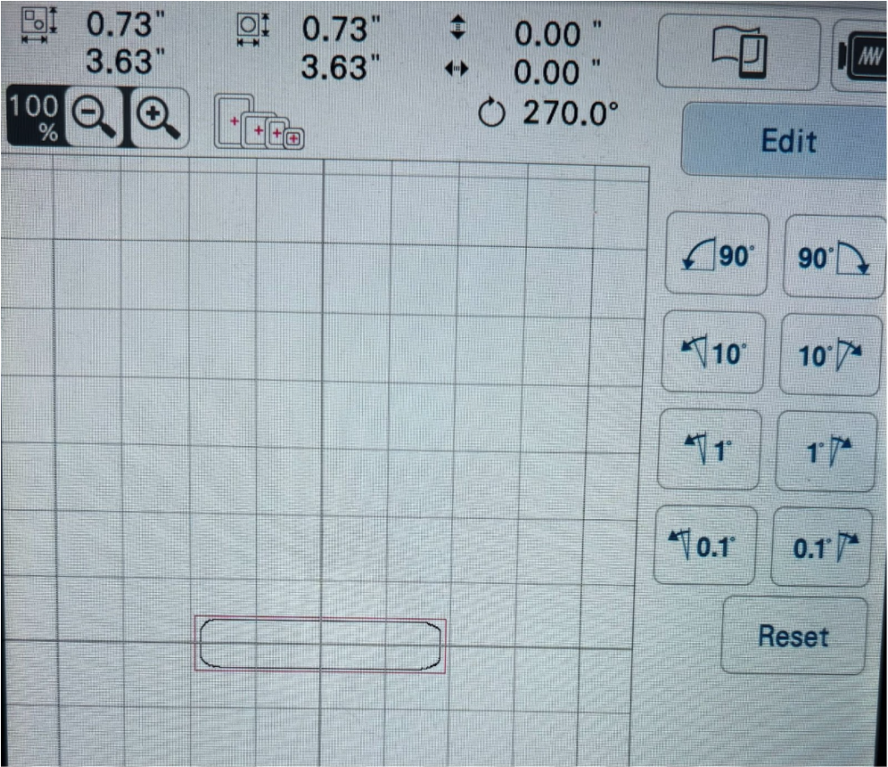On your embroidery machine, choose a simple rectangle shape to use as a placement guide. Set the width to ⅝”, or as small as your machine allows. My machine only goes down to ¾”, but that still works.