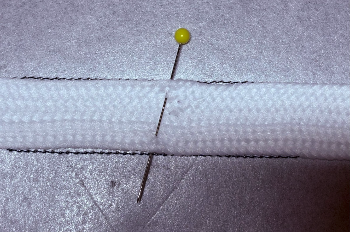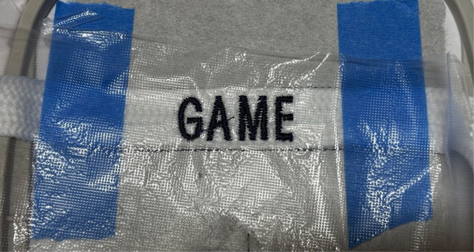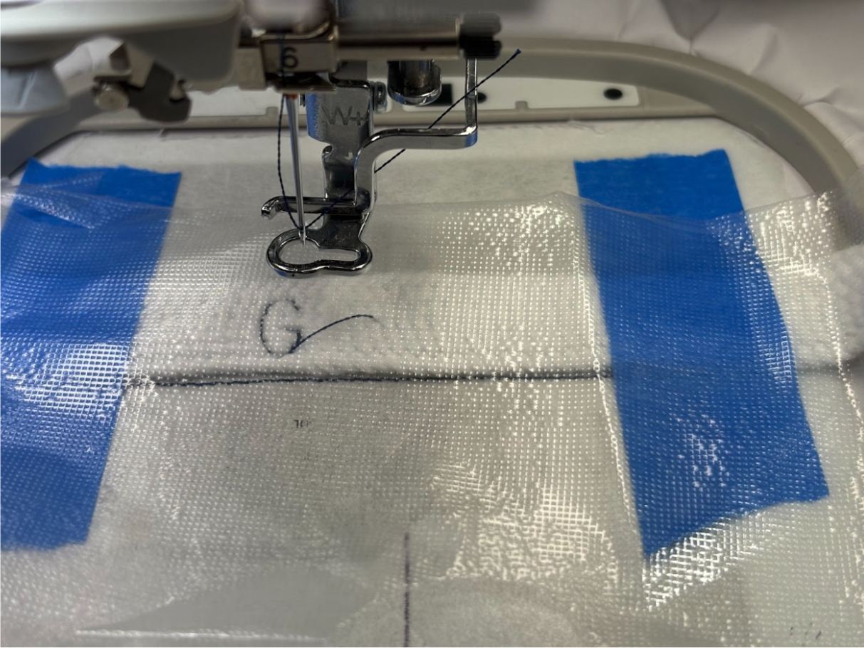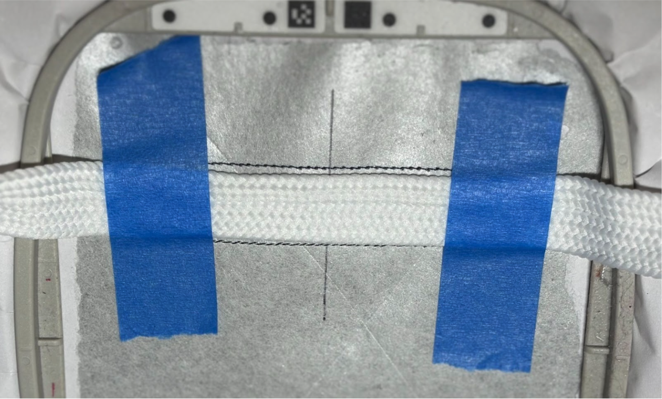 For added security and to keep the laces from shifting, place a small piece of tape on both sides of each lace before stitching. This will hold everything in place and give you a cleaner finish. Return the hoop to the machine.