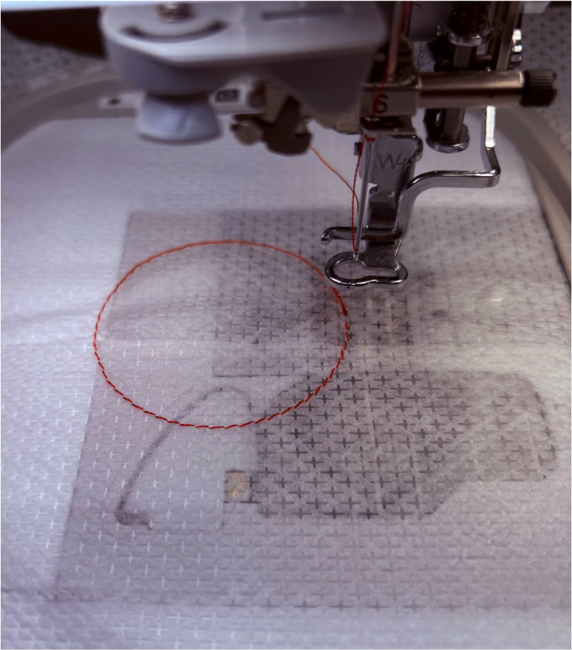 Place your vinyl or felt on top of the hoop, ensuring it fully covers the outline with a little extra space for trimming. Once it’s secure, continue stitching out the design.