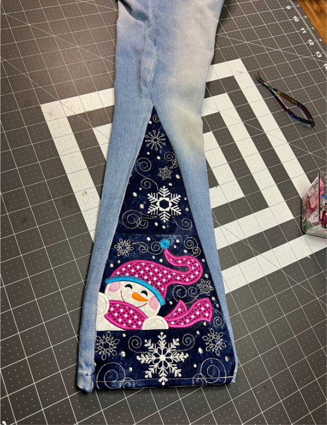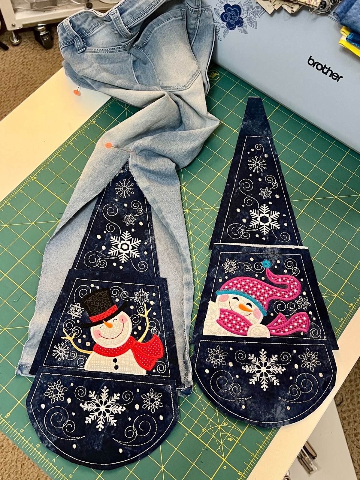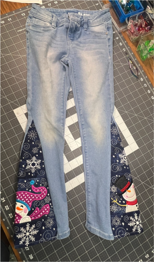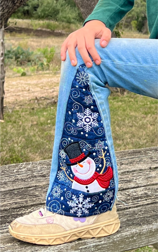 Upcycling jeans with embroidered inserts is such a fun and creative way to reimagine clothing and showcase your favorite ITH designs. Whether you choose the colorful Crazy Patch style or the cozy Snowman version, each pair becomes a wearable piece of art stitched with love.